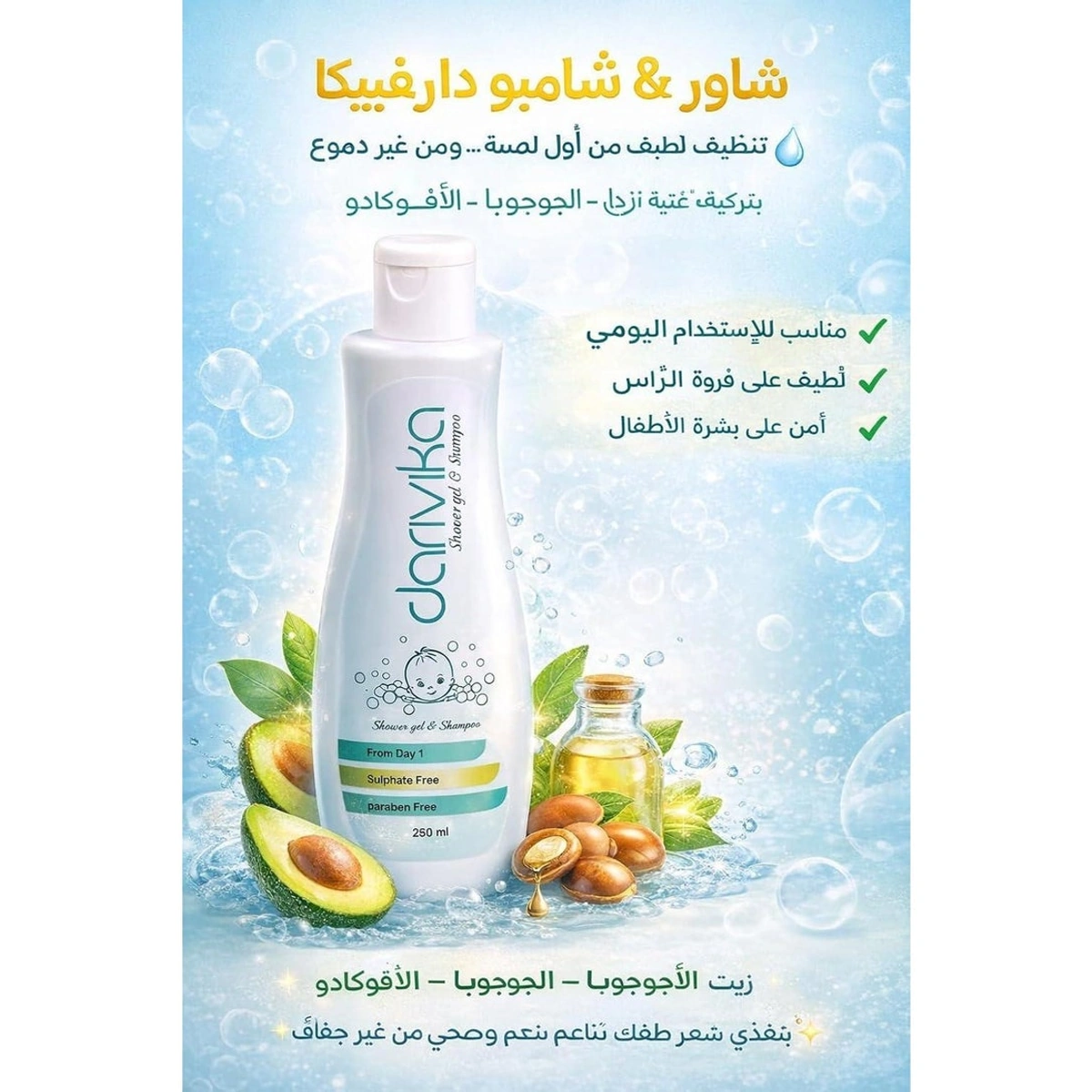 Give your baby superior care with Darivika 100% natural baby shower gel & shampoo, featuring a tear-free formula that nourishes sensitive skin and hair.