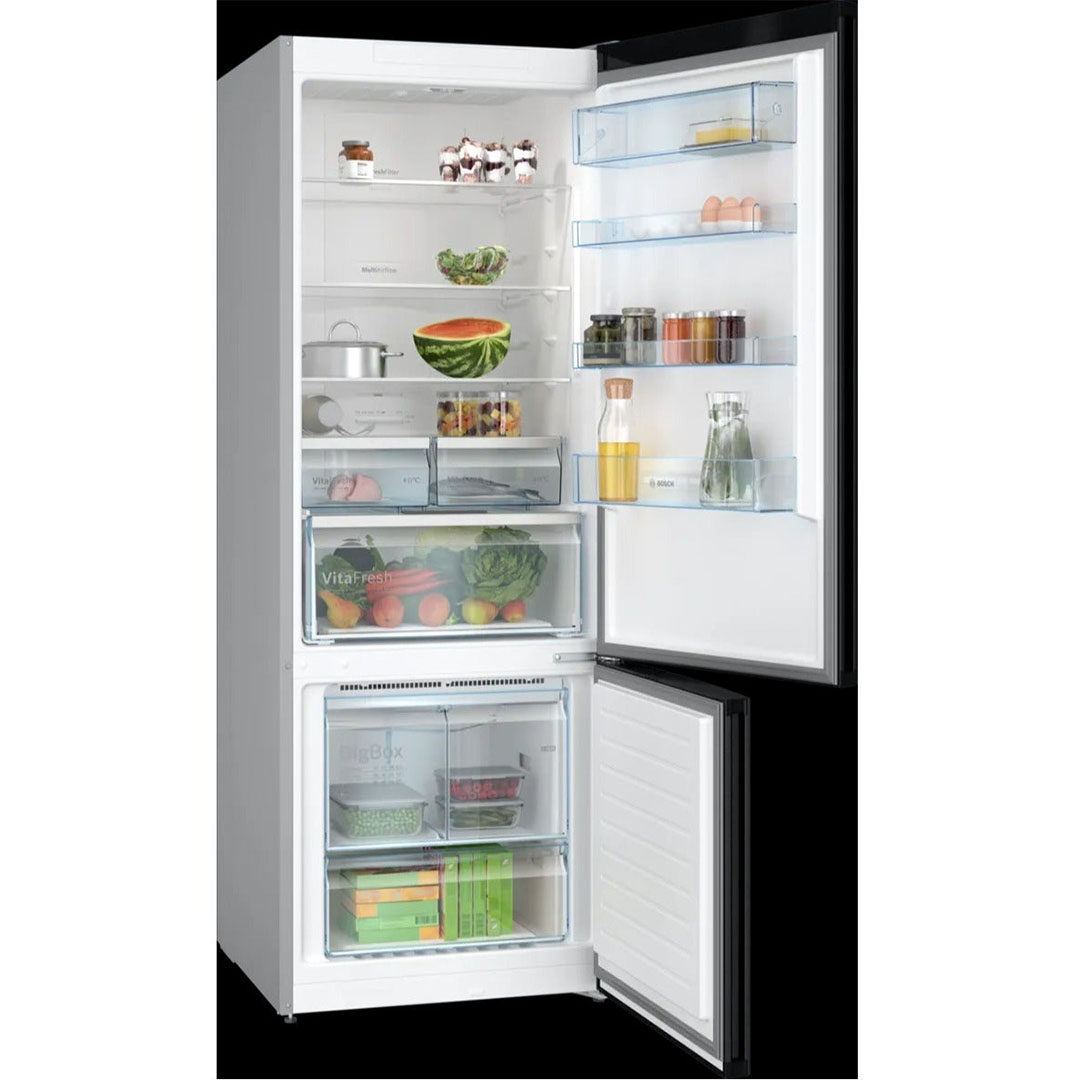 ثلاجة بوش Series 4 سعة 505 لتر مع فريزر في الأسفل سعة 140 لتر. تتميز بتقنية HyperFresh للحفاظ على الطعام طازجًا لفترة أطول، وتصميم عصري من الستانلس ستيل الأسود مع أرفف قابلة للتعديل وإضاءة LED.