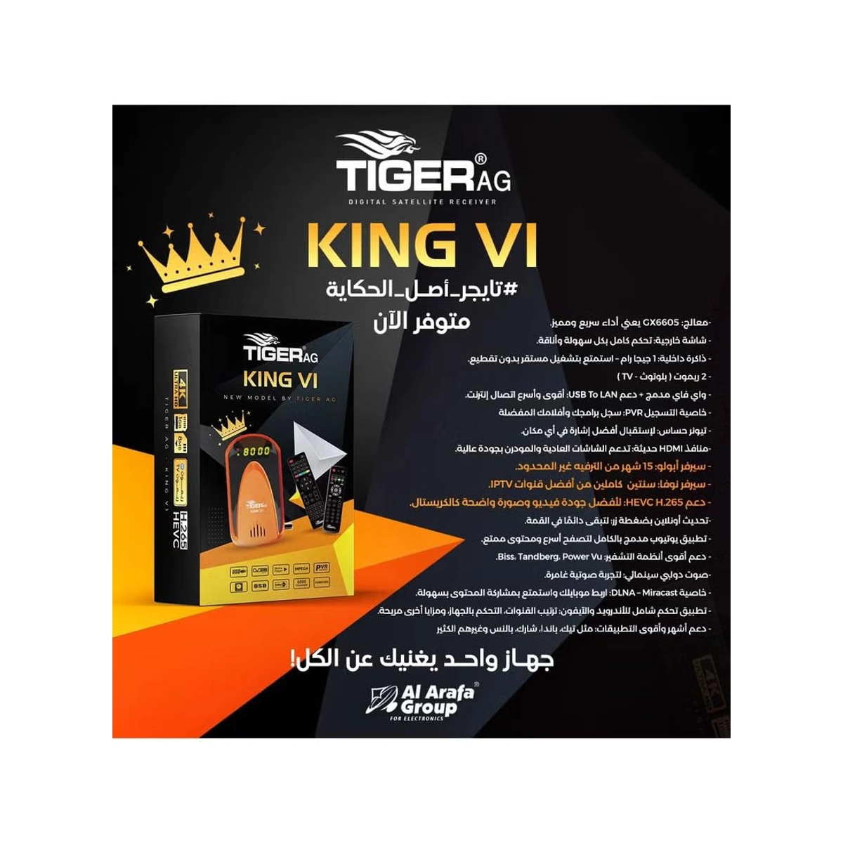 اكتشف ريسيفر ستالايت الرقمي AG King VI من تايجر باللون الأسود، المزود بتقنيات حديثة لتجربة مشاهدة مميزة. الجهاز يدعم ضغط H.265 لضمان صورة أوضح وعرض سلس عالي الدقة، مع اتصال مستقر عبر واي فاي وLAN لتلفزيون IPTV وتشغيل التطبيقات بسهولة. يمكن تسجيل البرامج من خلال منفذ USB ووظيفة PVR، وتشغيل الموسيقى والصور مباشرة. كما يحتوي على مخرج HDMI لتوصيل التلفزيونات الحديثة والقياسية، مع جهاز تحكم عن بعد مزدوج لسهولة الاستخدام. استمتع بمشاهدة البرامج المفضلة بأعلى جودة وراحة في التحكم مع AG King VI من تايجر.