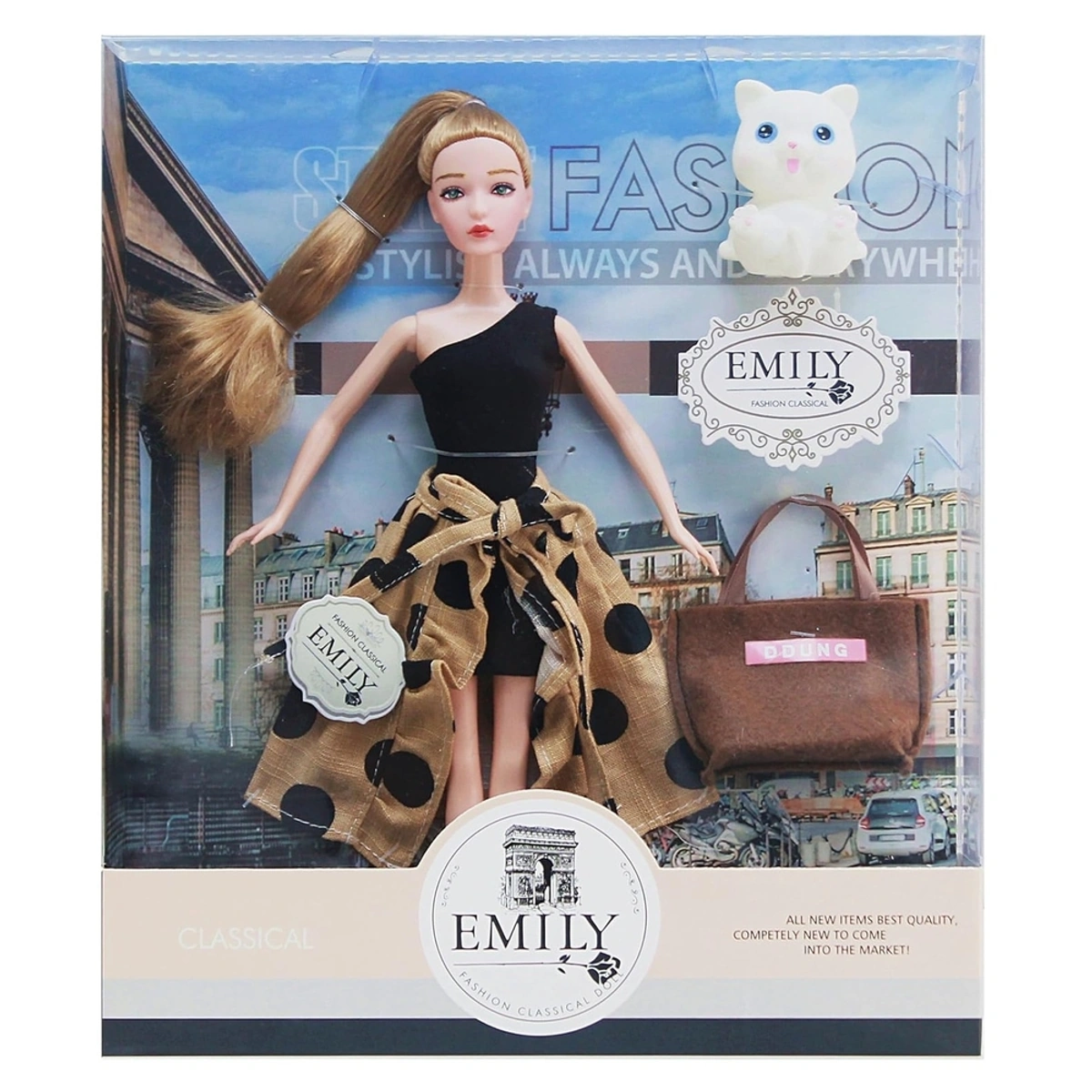 عروسة الموضة إيميلي مع حقيبة وقطة هي الرفيقة المثالية لكل الفتيات من عمر 3 إلى 5 سنوات! تتميز هذه العروسة بشعرها الطويل الذي يسهل تصفيفه، مما يمنح الأطفال الفرصة لتطوير مهاراتهم الإبداعية في عالم الموضة. تأتي إيميلي مع حقيبة أنيقة وقطة لطيفة، مما يضيف لمسة من المرح والتشويق إلى تجربة اللعب. ستكون هذه العروسة رفيقة مثالية لرحلات المغامرات والقصص الخيالية، مما يجعلها خيارًا رائعًا هدية لأحبائك من الصغار!