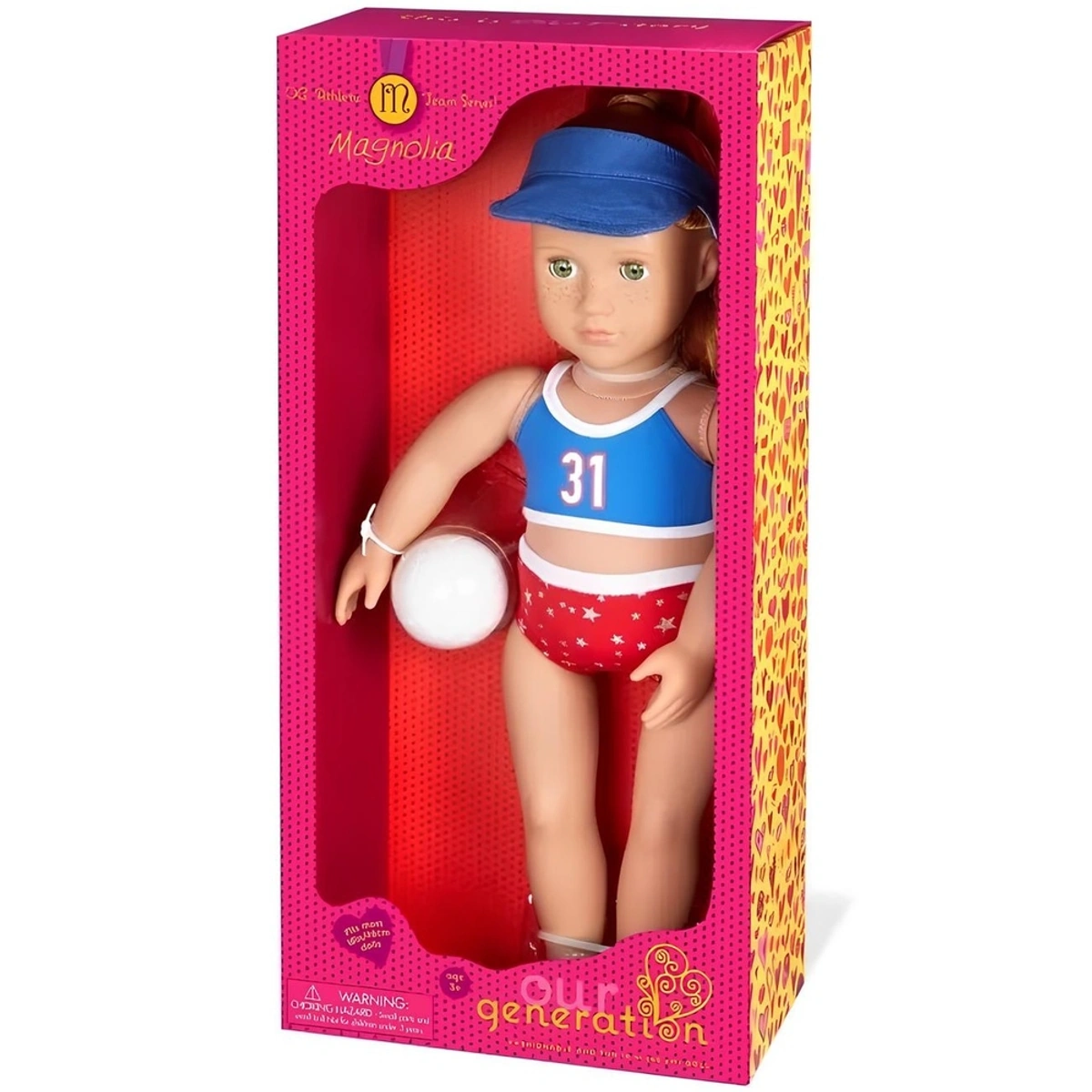 تقدم لكم ماركة "Our Generation" بفخر دمية لاعب كرة الطائرة المميزة، الموديل BD31367، التي تأتي بمقاس 18 بوصة. تعرفوا على ماغنوليا، نجمة الكرة الطائرة، التي تمتاز بعيونها الخضراء الزاهية التي تفتح وتغلق، ونمشها الرائع، وشعرها الأحمر الذي يمكن تصفيفه بطرق ممتعة. هذه الدمية ترتدي زي فريق الكرة الطائرة مع قبعة واقية، مما يجعلها مثالية لعشاق الرياضة. يمكن تحريك رأسها وأذرعها وساقيها بسهولة للعب بحركة مرنة، بينما تحمل قطعة السباحة رقمها المفضل (31) وسروال مزين بنقوش نجوم صغيرة. هذه اللعبة مصممة خصيصًا للبنات من عمر 3 إلى 5 سنوات، ولا تحتاج إلى بطاريات، مما يجعلها خيارًا آمنًا ومرنًا للعب. اجمعي ماغنوليا مع نجمة التنس إيميني ولاعبة الجمباز الرائعة نيا للحصول على مغامرات رياضية أكثر متعة وإثارة!