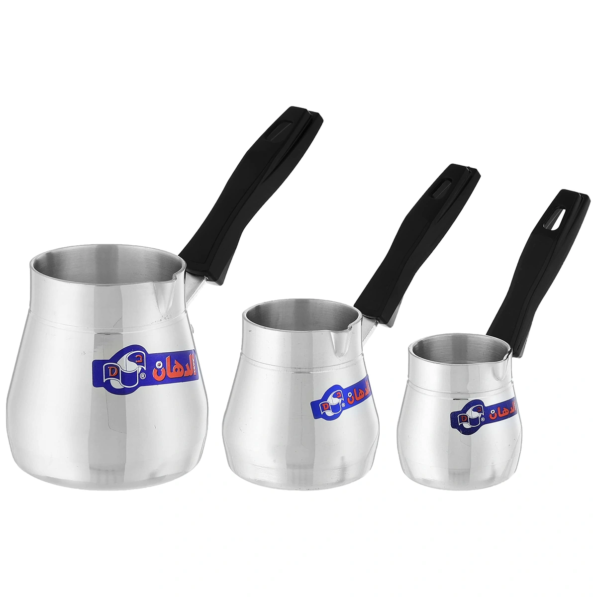طقم الكنك من الدهّان باللون الفضي يقدم تجربة تحضير مشروبات عملية وآمنة بفضل الأيادي المصنوعة من البكاليت الألماني غير الموصل للحرارة. يشمل ثلاث قطع بأحجام مختلفة لتناسب جميع احتياجاتك في تقديم الشاي أو القهوة، مع تصميم أنيق ومتين يثبت على الإناء بالبرشام.