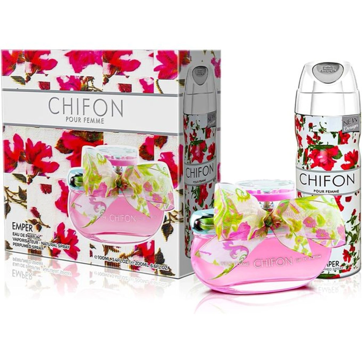 اكتشفي الأنوثة والرقي مع طقم هدايا Emper Chifon، عطر زهري خشبي مسكي يدوم طويلاً مع بخاخ جسم منعش، مثالي للنساء الأنيقات في كل الأوقات.