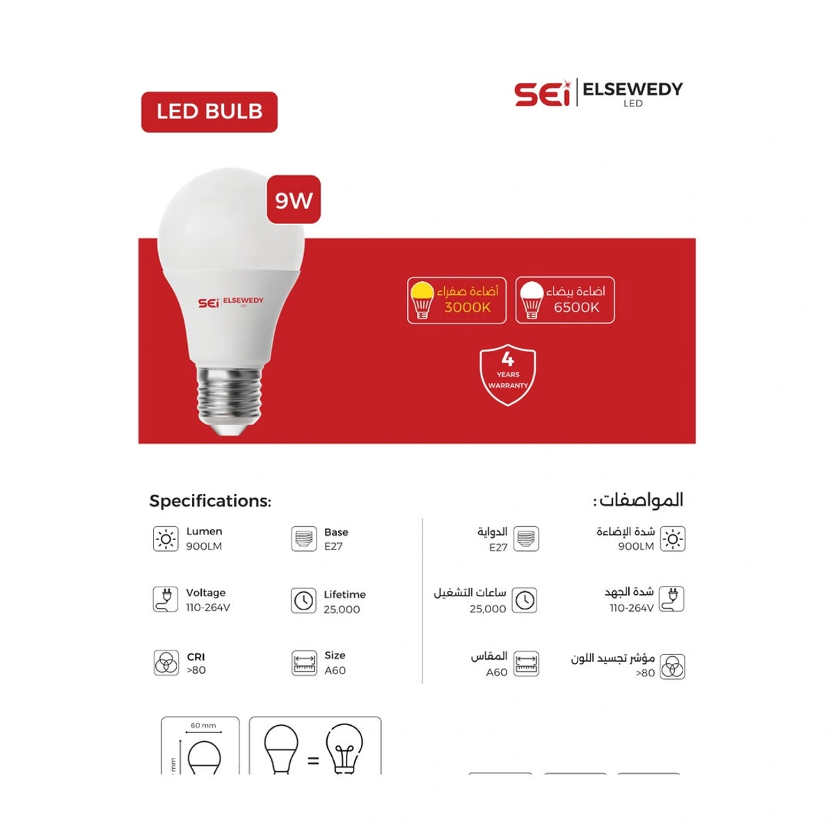 لمبة ليد من السويدي بقدرة 9 وات وقاعدة E27 توفر إضاءة أبيض بسطوع 900 لومن، ومناسبة للاستخدام اليومي في المنزل أو المكتب.