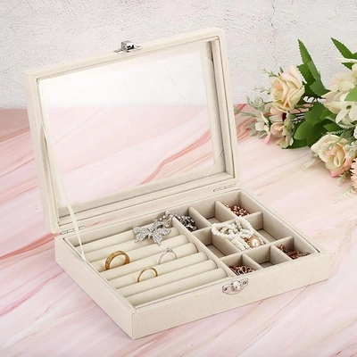 علبة مجوهرات قطيفة بغطاء زجاج - بيج