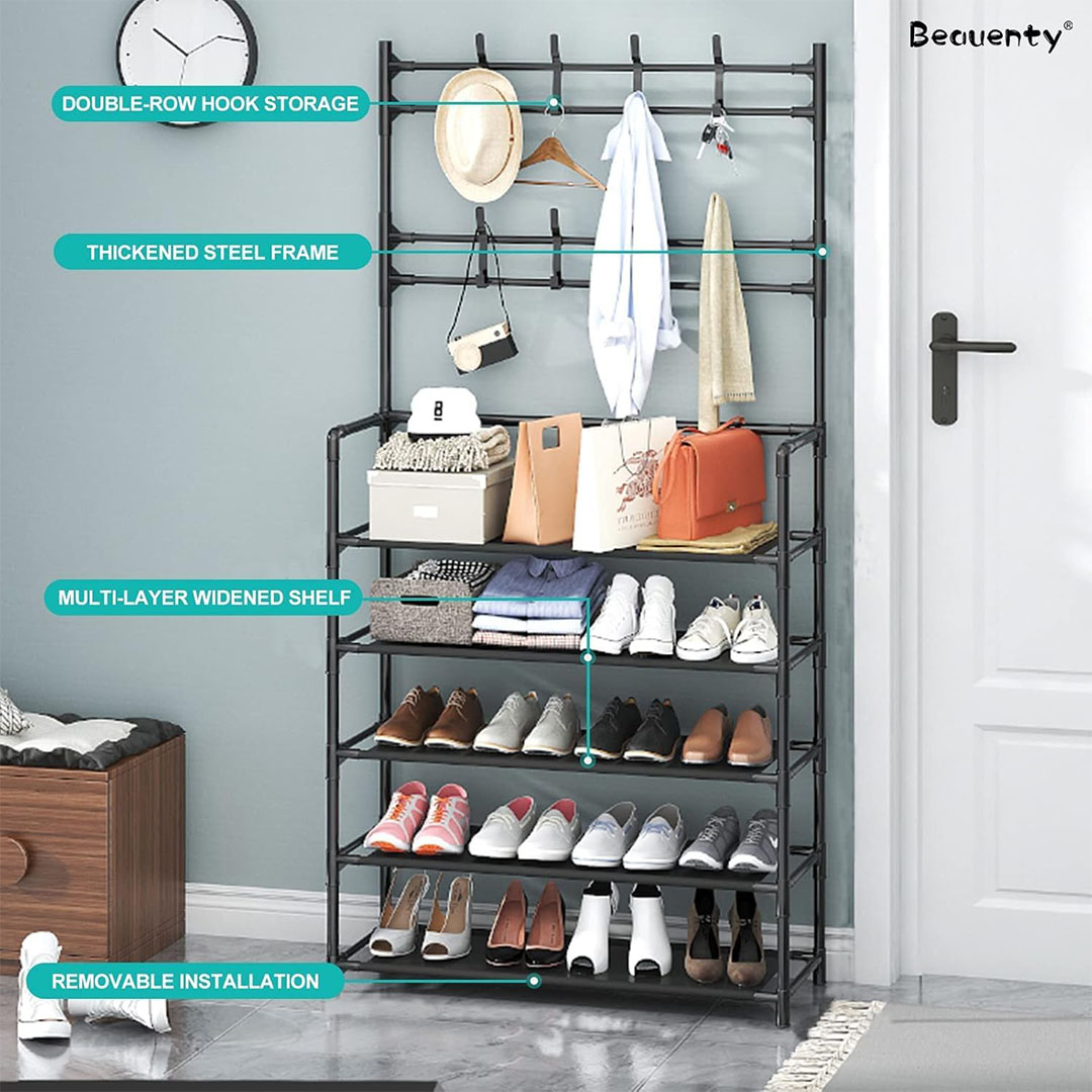 • منظم رف الأحذية متعدد الوظائف وعملي، لأنه يوفر حلاً مضغوطًا وموفرًا للمساحة لتخزين أحذيتك، ويمكن استخدامه لحمل الأشياء الأخرى، الرف العلوي. تتوفر الخطافات لتعليق الملابس والقبعات وحقائب اليد والمظلات والمفاتيح وما إلى ذلك بشكل مريح.