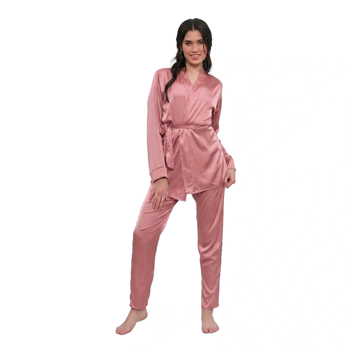 استمتعي بالراحة الفائقة والأناقة الساحرة مع بجامة Gamal sons الستان المكونة من 5 قطع باللون البينك الجذاب. طقم مثالي لليالي هادئة وأوقات استرخاء فاخرة في منزلك.
