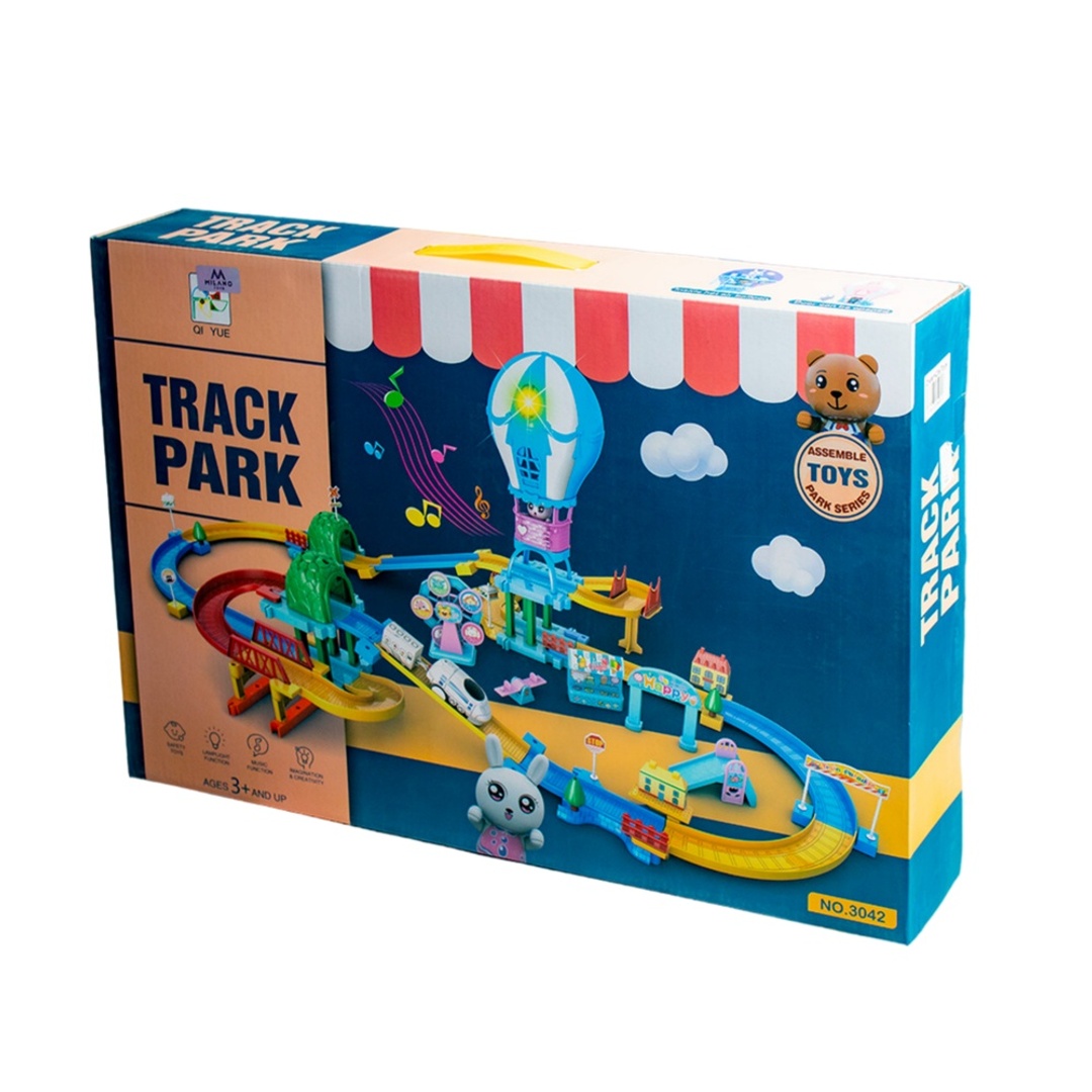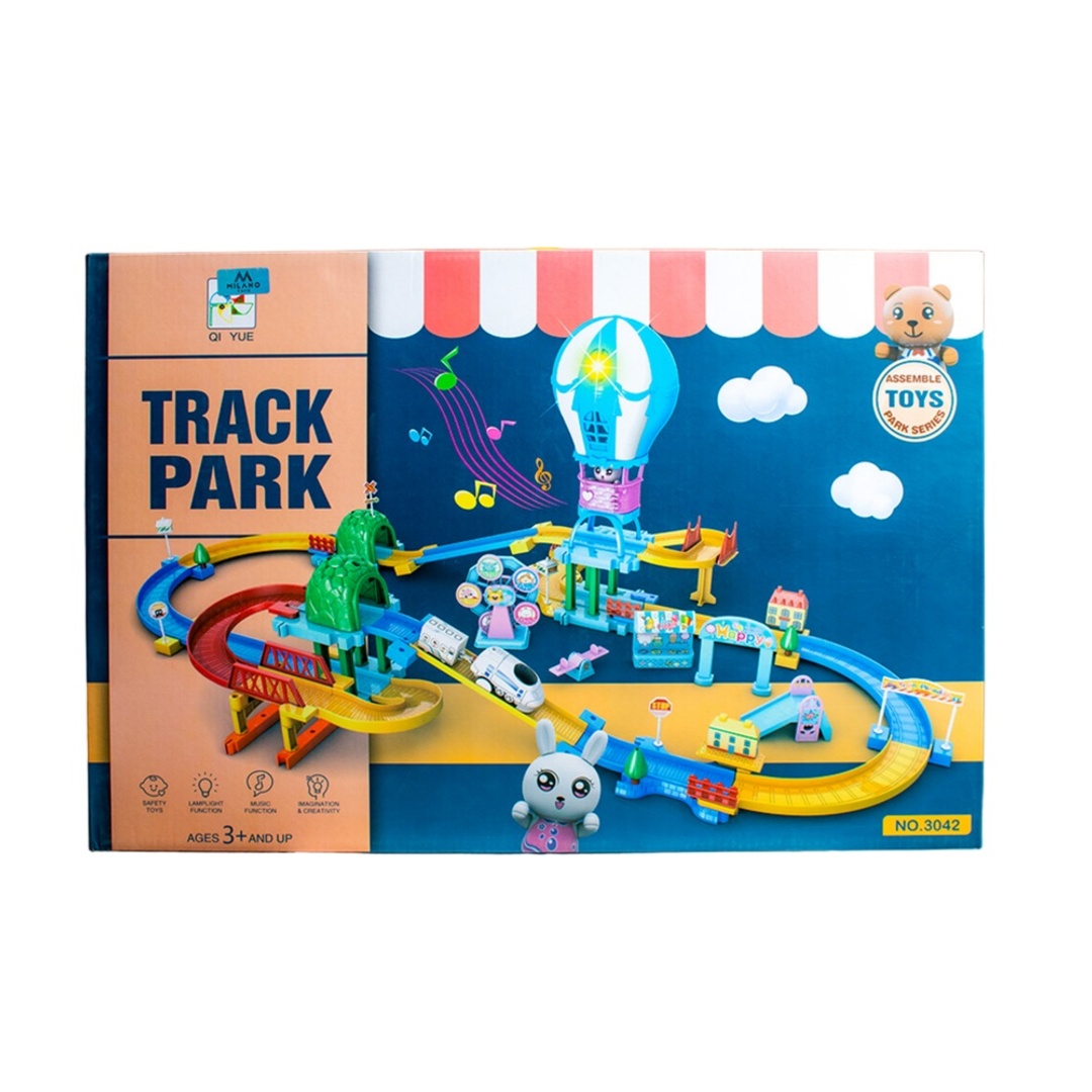 لعبة تجميع تراك بارك مع الملحقات التي تتيح لطفلك اللعب بحديقة المسار التي تحتوي على قطار وبعض العناصر المرئية الضوئية والصوتية للاستمتاع بها.
