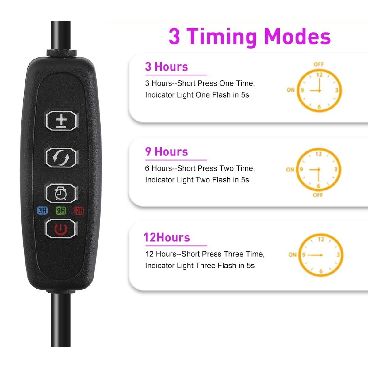 - وظيفة التوقيت التلقائي (3، 6، 12 ساعة) مع إمكانية ضبط المسافة بين الضوء والنباتات.