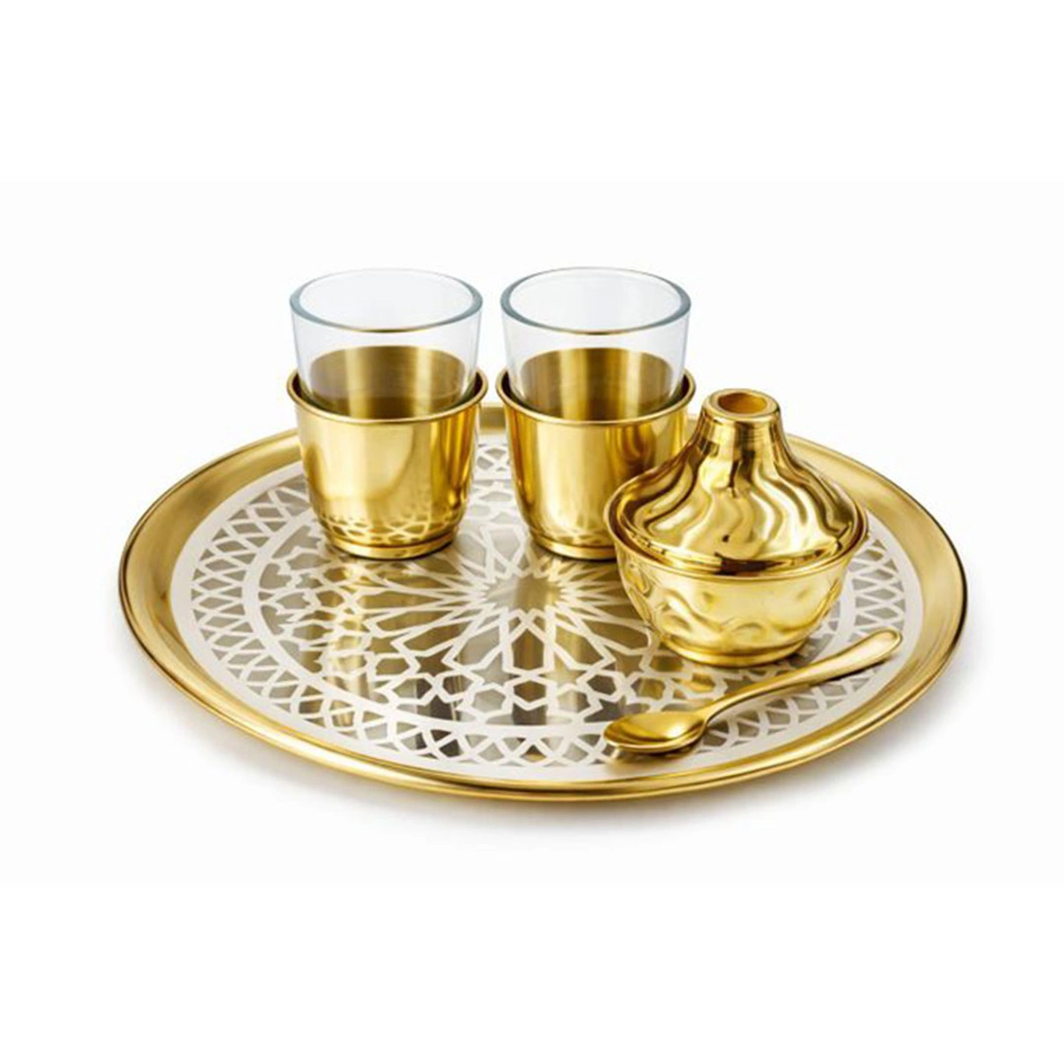 استمتع بلحظات الشاي الفاخرة مع طقم الشاي التركي الكامل باللون الذهبي، الذي يجمع بين الأناقة والتقاليد. يتضمن الطقم صينية راقية وكوبين مزخرفين مع حوامل جميلة، بالإضافة إلى وعاء سكر أنيق وملعقة متناسقة. تصميمه الفريد يبرز التفاصيل الزخرفية المبهرة، مما يجعله الخيار المثالي لتقديم الشاي في المناسبات الخاصة أو لتزيين مائدتك اليومية. امنح ضيوفك تجربة شاي لا تُنسى مع هذا الطقم الرائع الذي يضيف لمسة من الفخامة إلى كل لحظة.