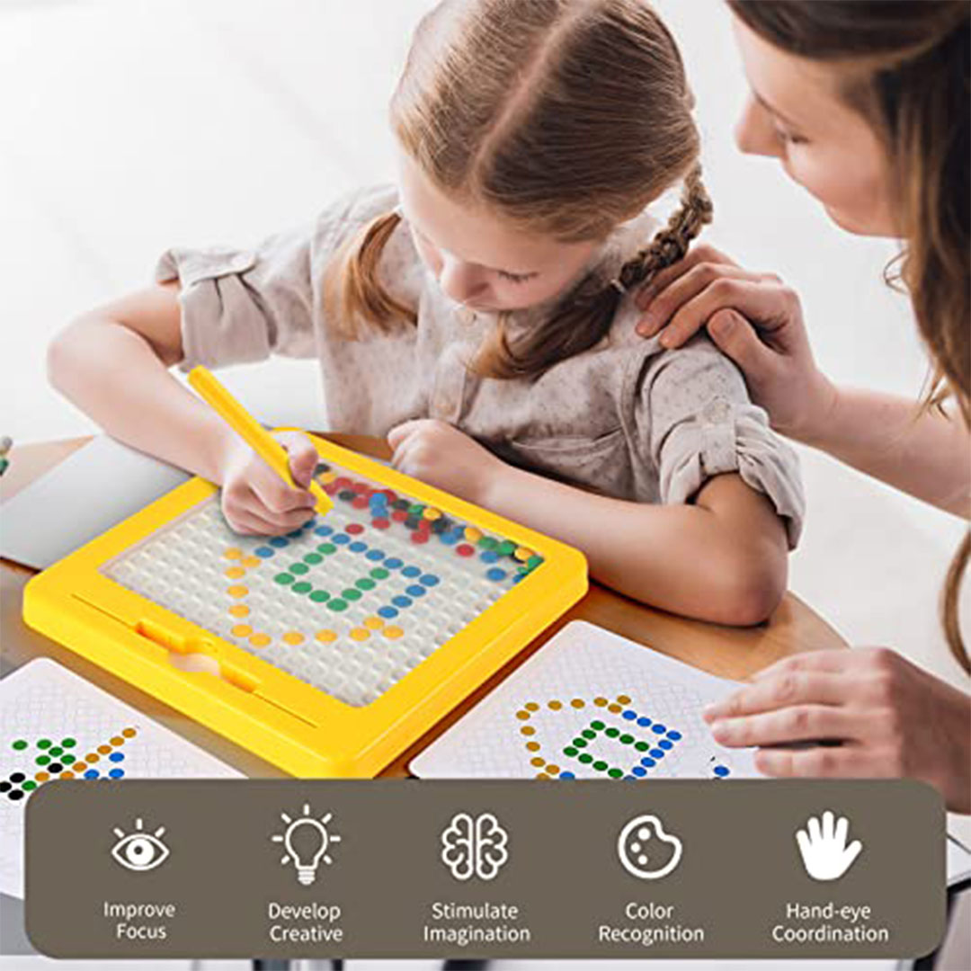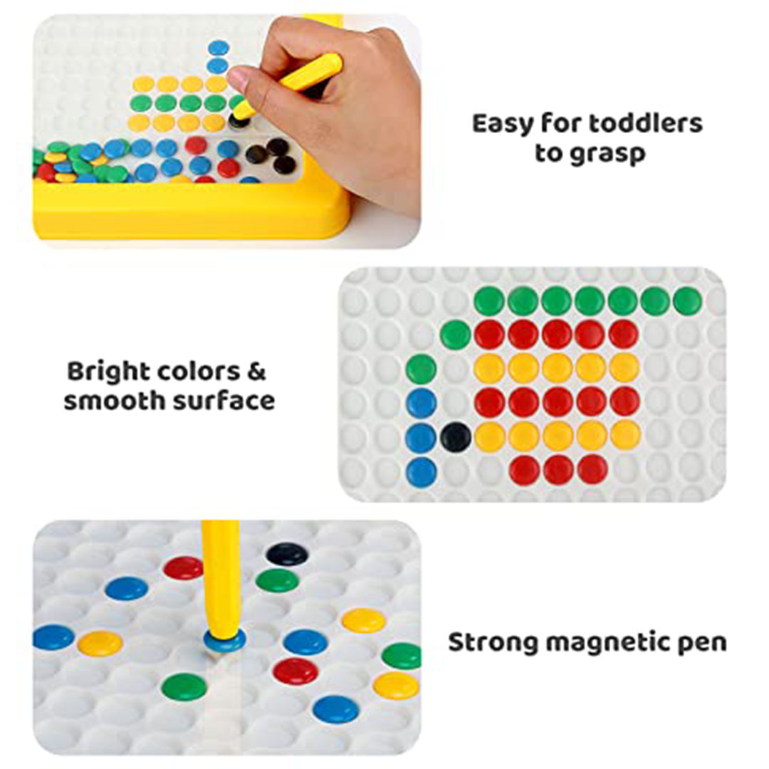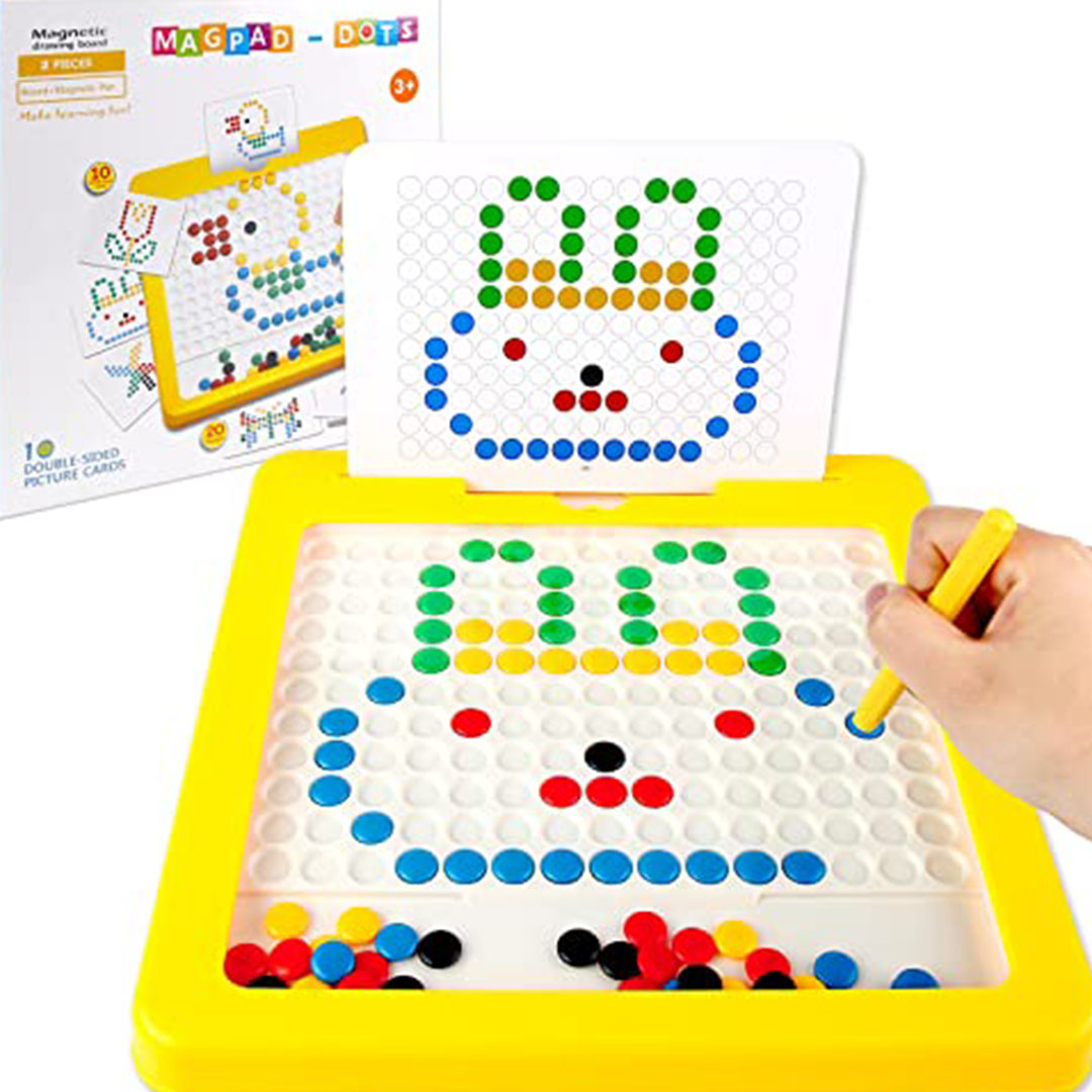 - مواد متينة: مصنوعة من بلاستيك قوي وآمن، مع حبات مغناطيسية محكمة داخل لوحة شفافة لتفادي فقدانها أو ابتلاعها.