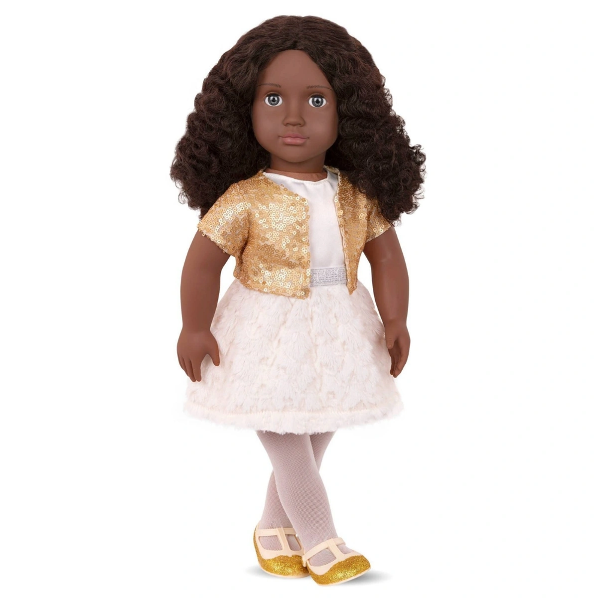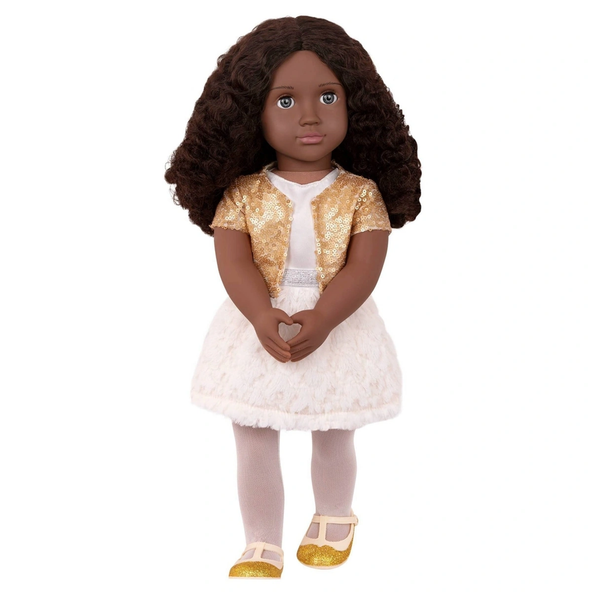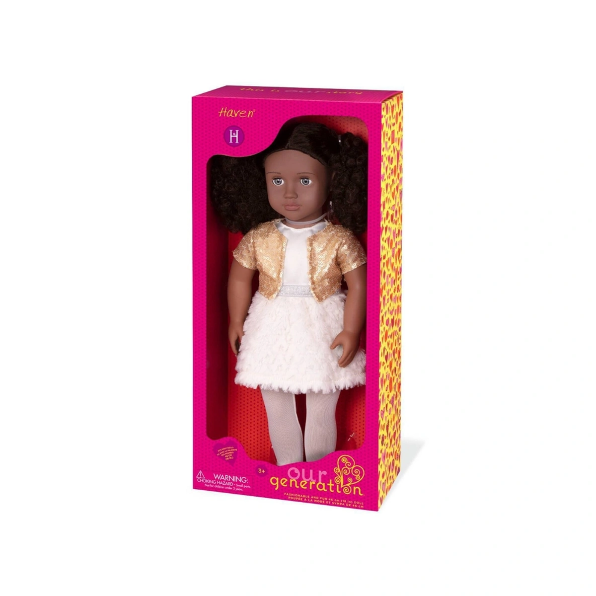 تقدم لكم ماركة "Our Generation" دمية العطلة المثالية، الموديل BD31089Z، التي تتناسب تمامًا مع اهتمامات الفتيات في عمر 3-5 سنوات. تتميز هذه الدمية بمقاس 18 بوصة، وشعر أسود طويل ومجعد، مع عيون رمادية فريدة تفتح وتغلق. تأتي شخصية هافن محبوبة، حيث تجيد الاحتفال بالأعياد وتحب قضاء أوقات مميزة مع الأصدقاء والعائلة. ترتدي هافن زيًا رائعًا يتكون من فستان أبيض أنيق مزين بتنورة من الفرو الصناعي بنقشة متداخلة، بالإضافة إلى سترة قصيرة مرصعة بالترتر الذهبي، وجوارب بيضاء مع حذاء ذهبي لامع. هذه الدمية جاهزة للقاء صديق جديد في موسم الأعياد، ولا تحتاج إلى بطاريات، مما يجعلها جاهزة للعب الفوري وتمنح الأطفال تجربة لعب مميزة وممتعة. تعتبر هافن الخيار المثالي لتشجيع الإبداع والخيال في أوقات اللعب!