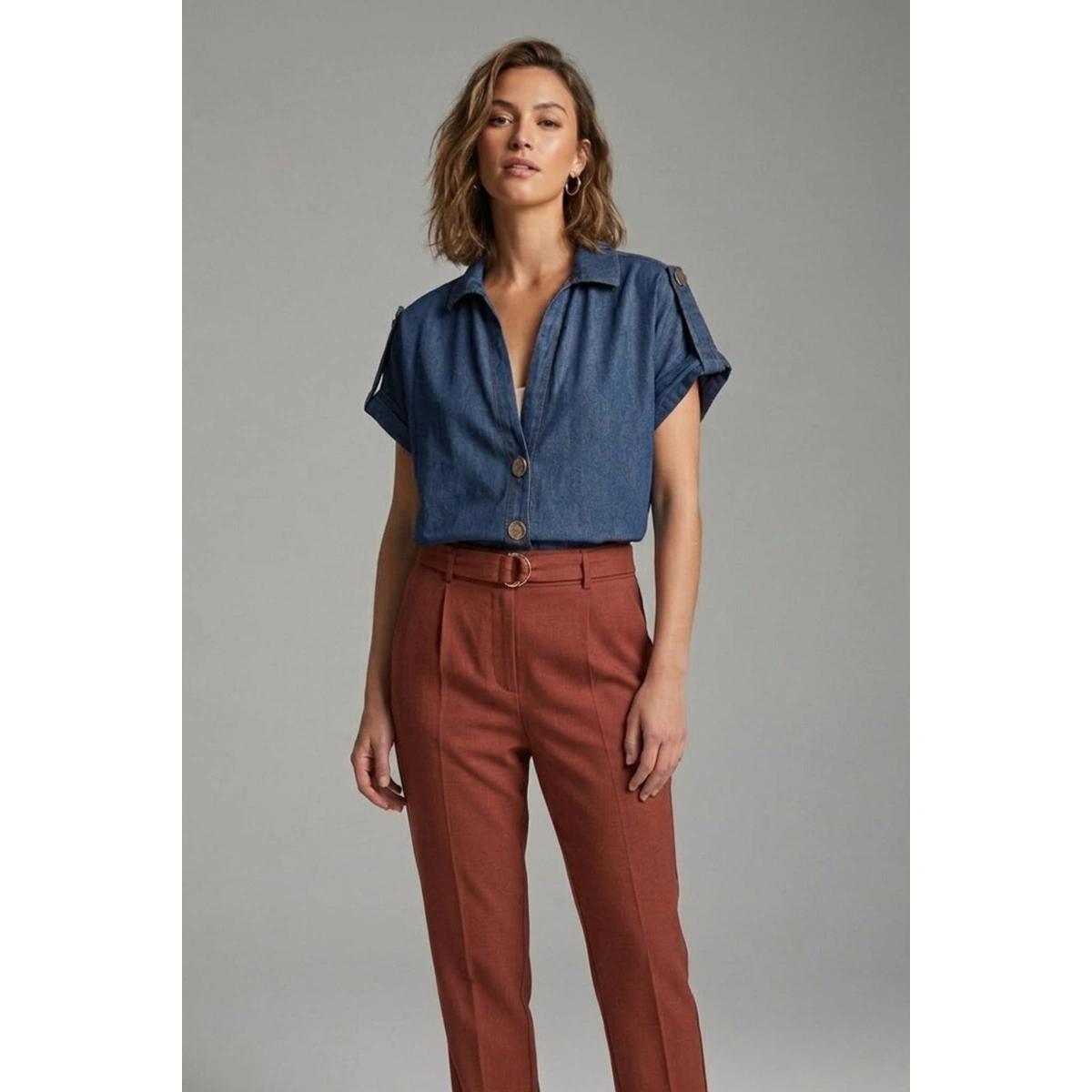 - تفاصيل القصة: أكمام قصيرة بأساور ملفوفة، ياقة كلاسيكية، فتحة رقبة على شكل V عميقة، أحزمة كتف
