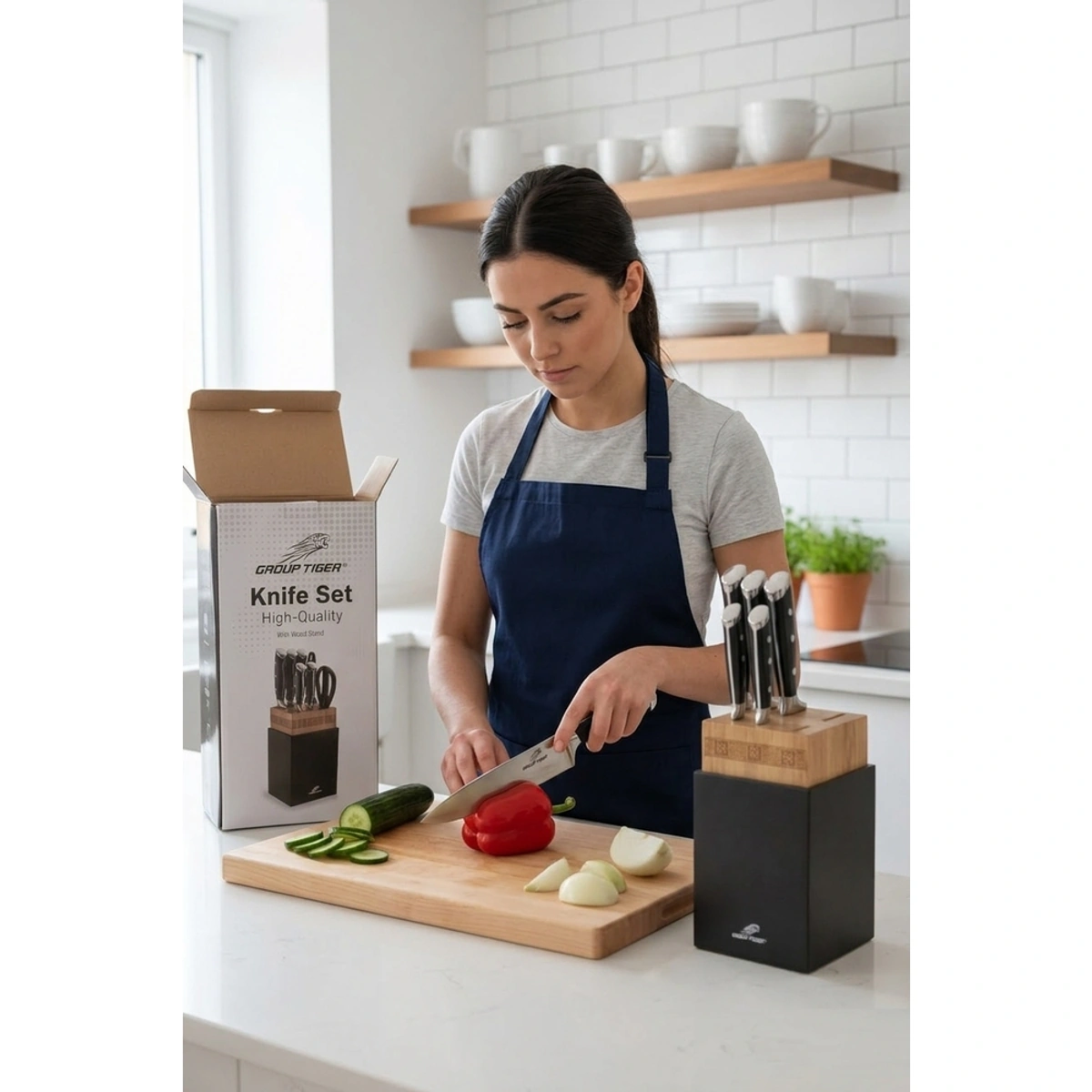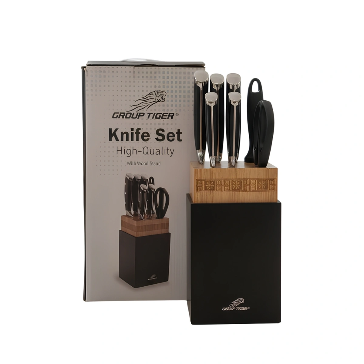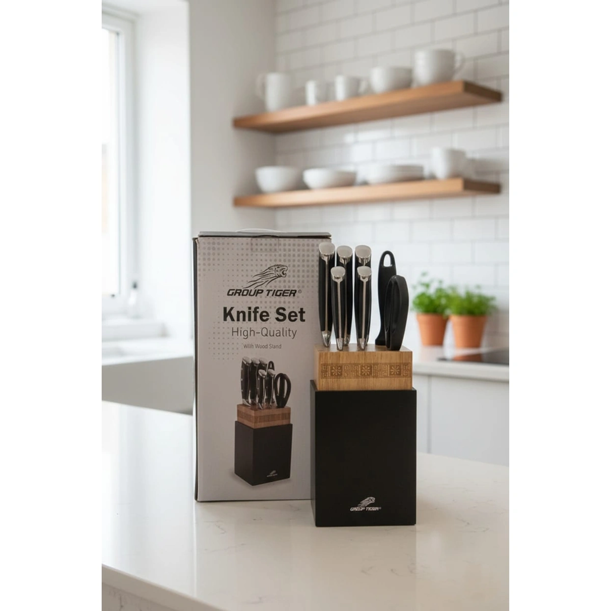 طقم سكاكين Group Tiger بتصميم رخامي أنيق ومبتكر، يضم 7 قطع عملية مع حامل خشبي متطابق ومسن مدمج. مثالي لمطبخك العصري، يوفر لك دقة تقطيع لا مثيل لها وجمالية ساحرة.