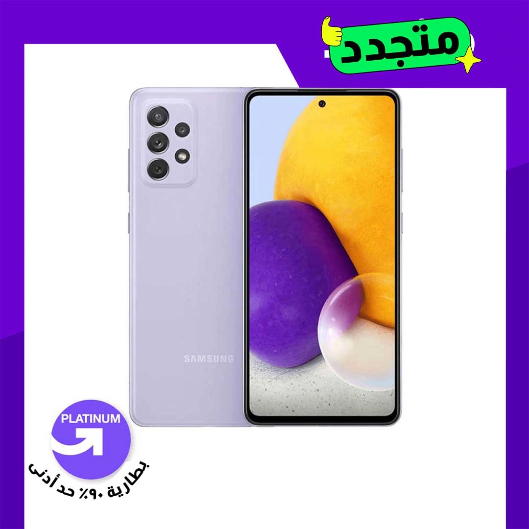 امتلك سامسونج A72 مجدد 128/6 جيجا باللون البنفسجي بمعالج Snapdragon 720G وأداء سلس، مع شاشة 6.7 بوصة سوبر أموليد تدعم 90Hz، وكاميرا 64MP بجودة تصوير عالية، وبطارية 5000mAh تدعم الشحن السريع