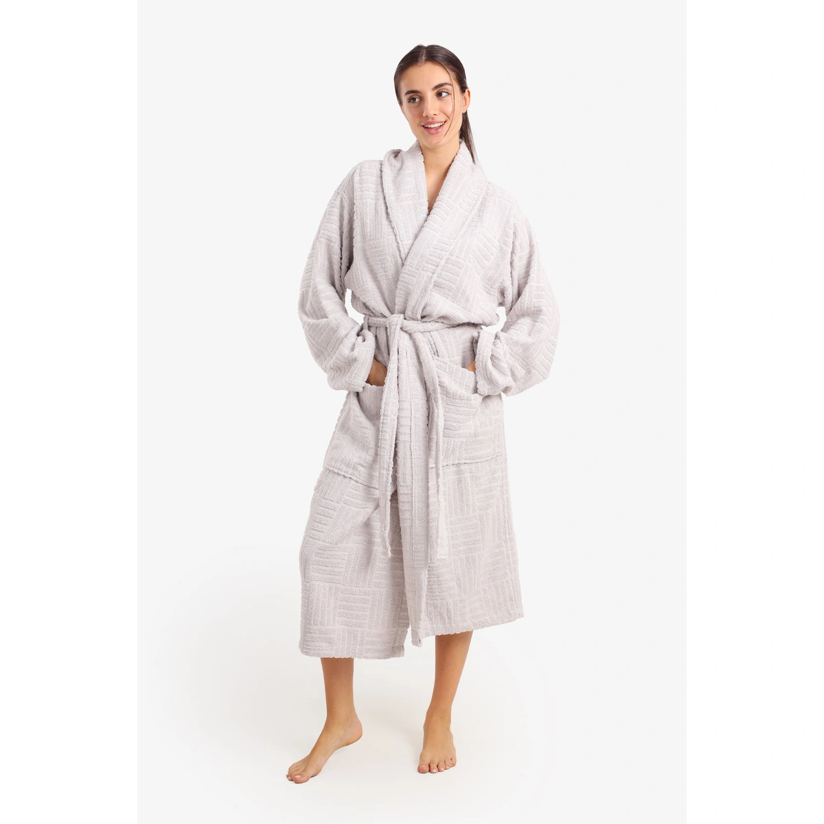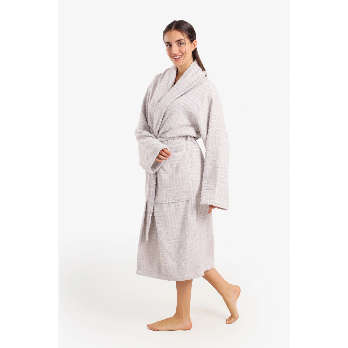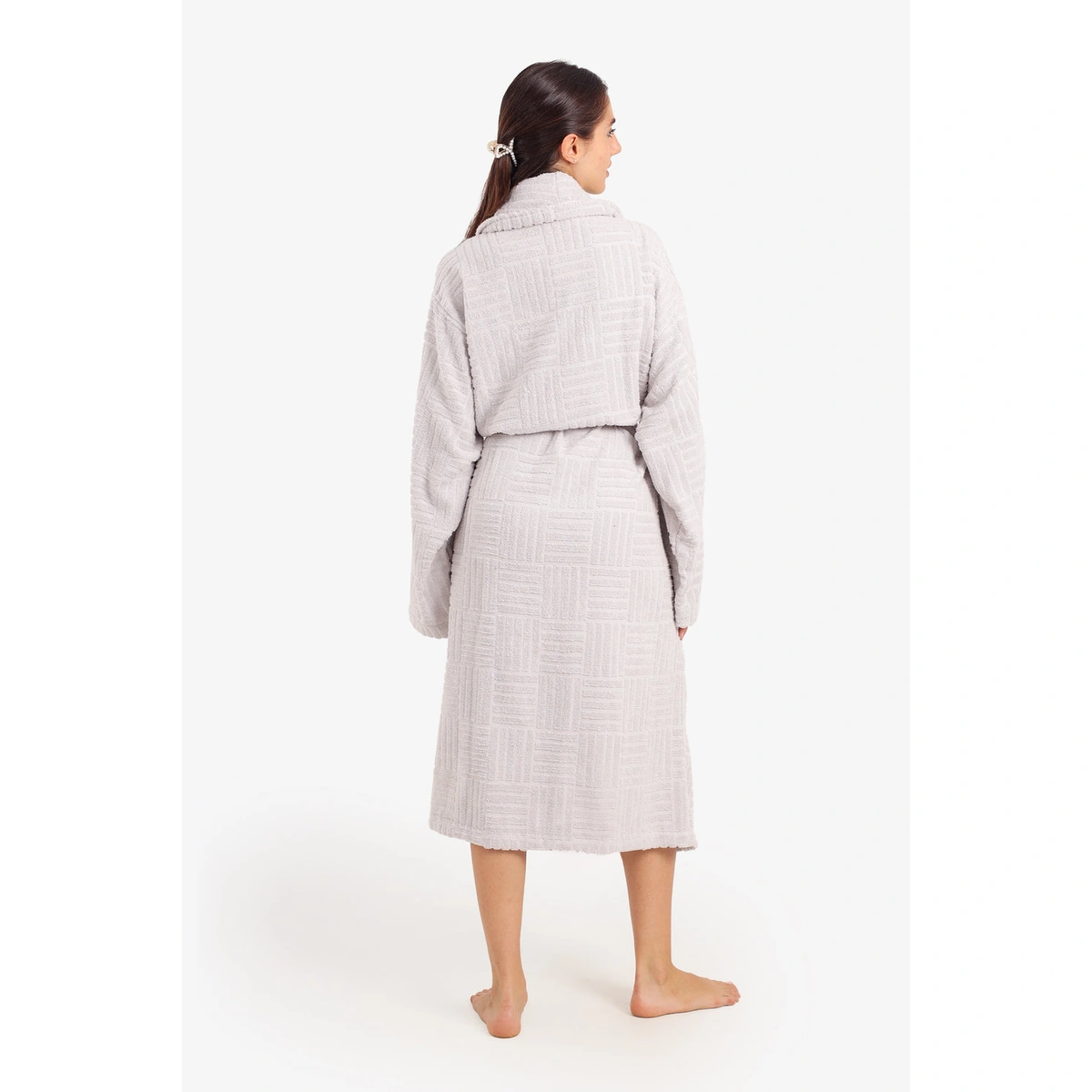 استمتعي بأقصى درجات الراحة والأناقة مع روب حمام كارينا القطني بنقشة المربعات ولون أبيض ناصع. تصميمه المريح وحزام الخصر يضمنان لكِ إطلالة جذابة ومريحة في منزلك.