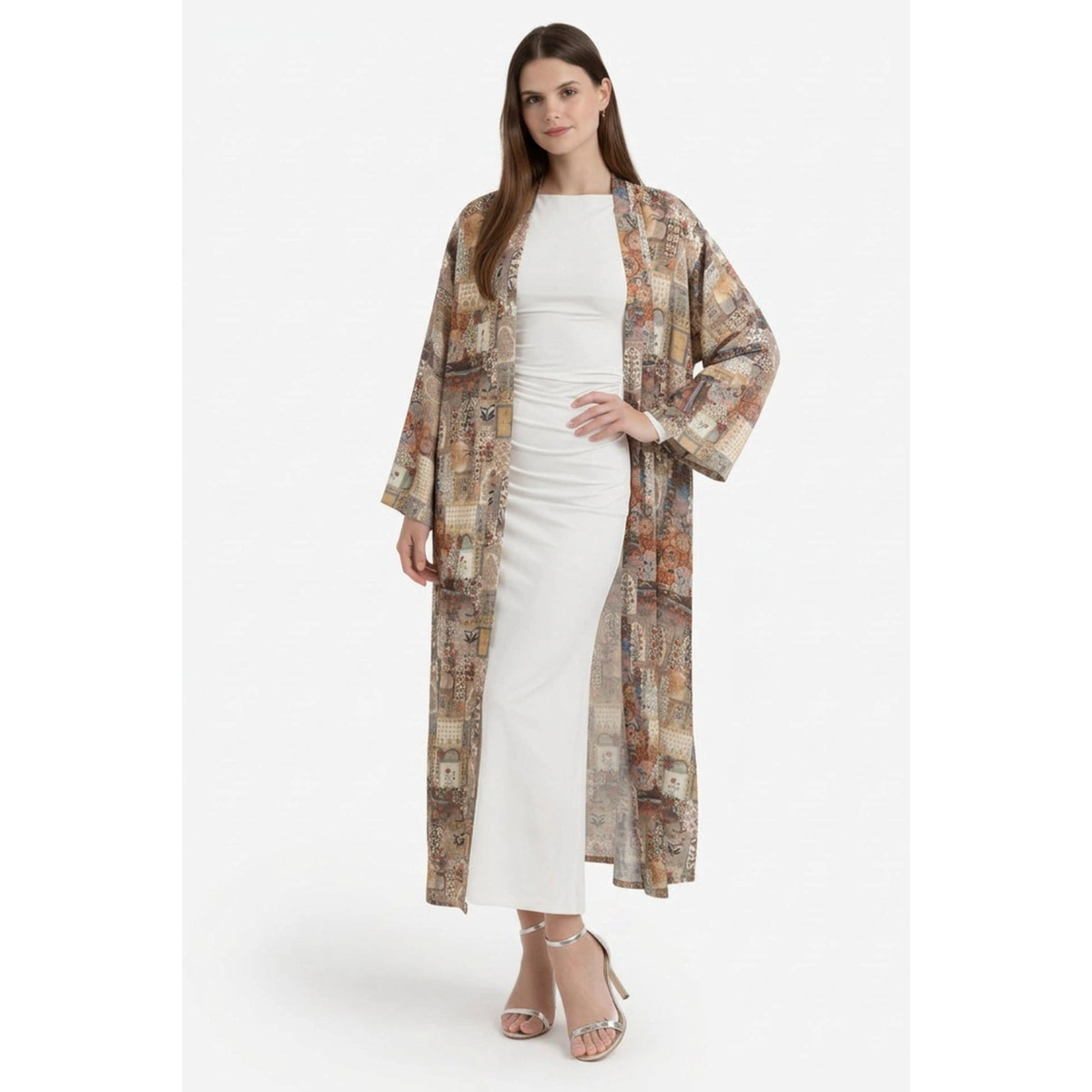 - التصميم: طول ماكسي، أكمام واسعة وطويلة، فتحات جانبية
