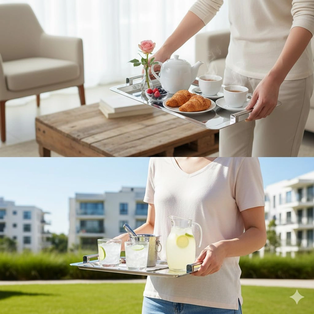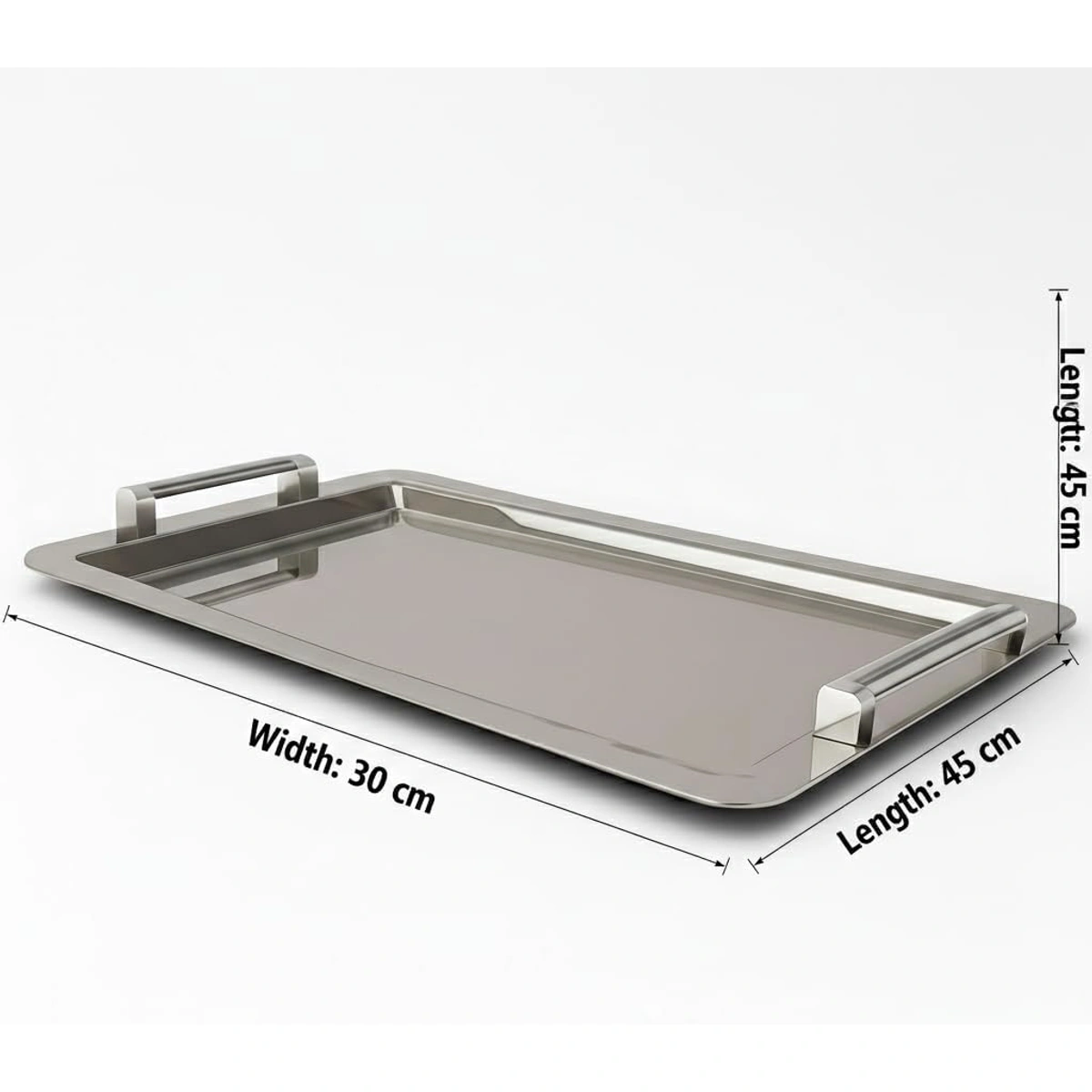 قدمي الأطعمة والمشروبات بشكل أنيق مع صينية التقديم من كوين المصنوعة من الاستانلس ستيل عالي الجودة، التي تجمع بين المتانة والمظهر العصري. بفضل حجمها العملي، توفر مساحة مناسبة لتقديم المشروبات، الحلويات أو الوجبات بسهولة، بينما يضيف اللون الفضي لمسة راقية على السفرة. تصميمها المتين يجعلها مناسبة للاستخدام اليومي والعزومات، كما أنها سهلة التنظيف ولا تحتفظ بالروائح، لتكون اختيار عملي في كل مطبخ.