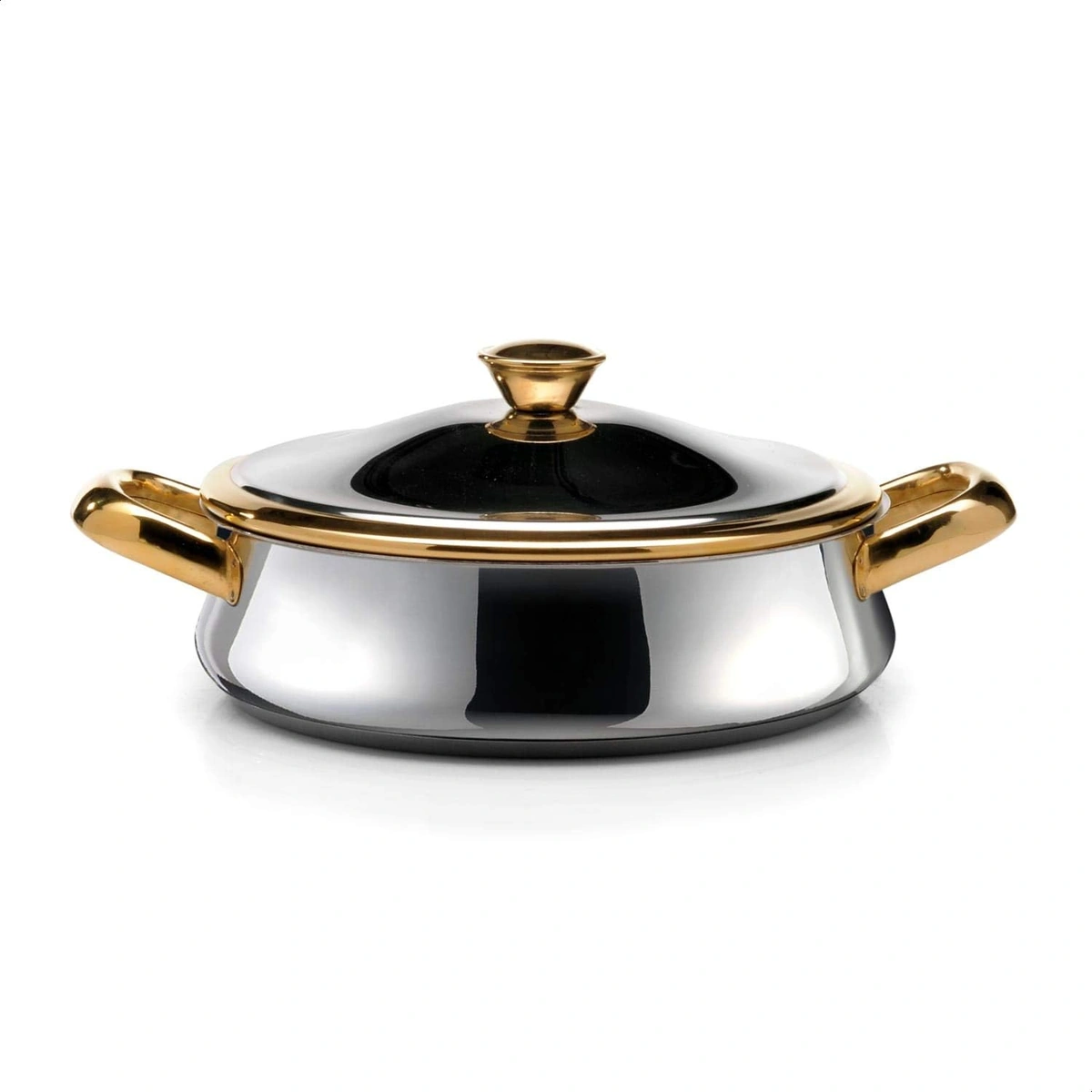 صينية فرن زهران 28 سم باللون الفضّي والذهبي مصنوعة من ستانلس ستيل متين مع مقابض ذهبية وغطاء متين، توفر توزيع حرارة مثالي لطهي اللحوم والخضروات والمعجنات. تصميمها الأنيق والعملي يجعلها إضافة رائعة لمطبخك، مع تحمل درجات الحرارة العالية وسهولة التنظيف.