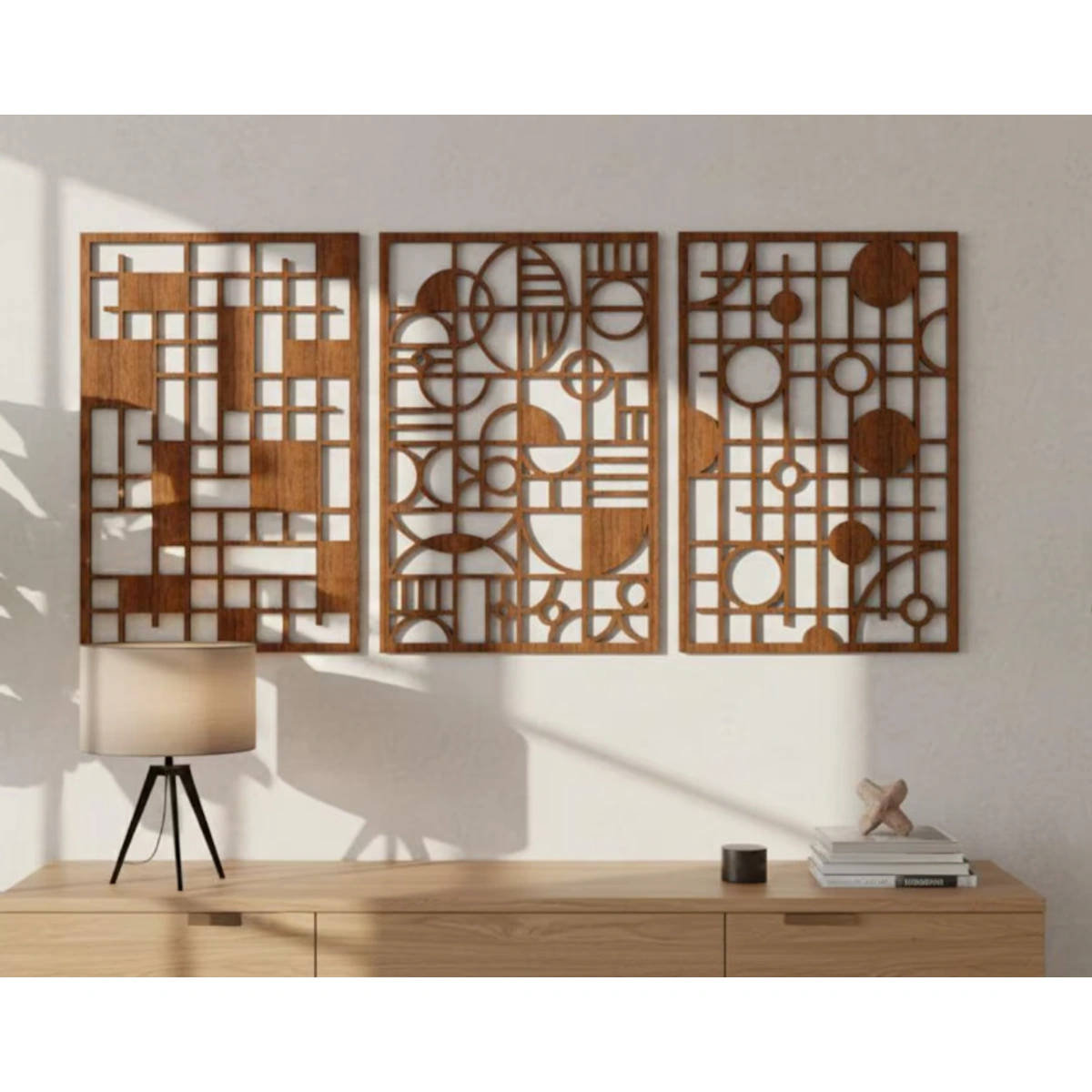 جدد ديكور منزلك مع طقم ألواح ATM الخشبي الثلاثي الأنيق. تصميم هندسي عصري يضيف لمسة فنية فريدة لأي جدار، مثالي لغرف المعيشة والاستوديوهات.