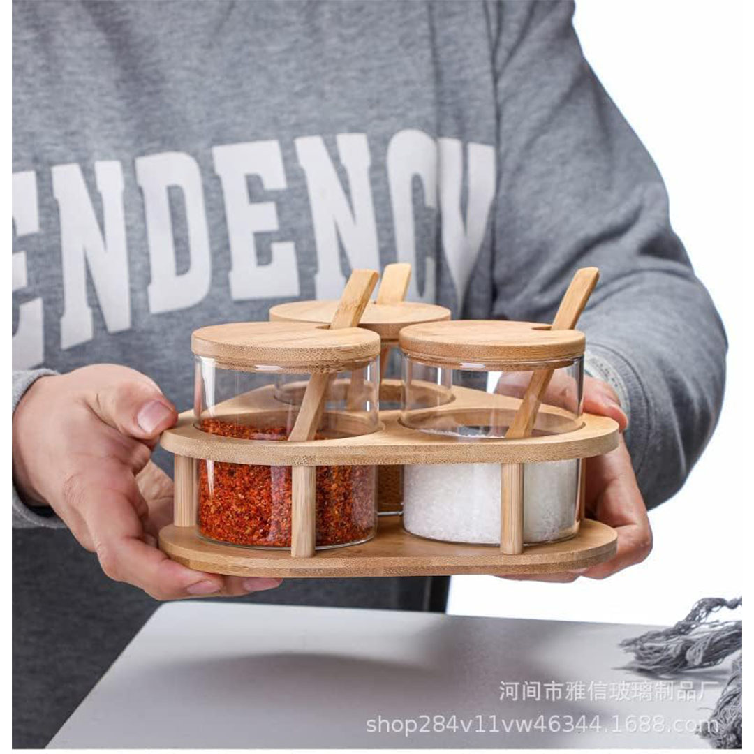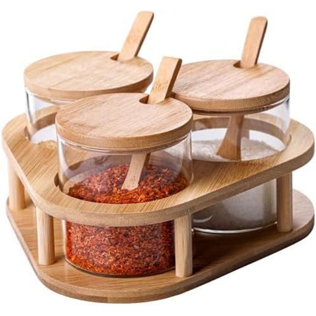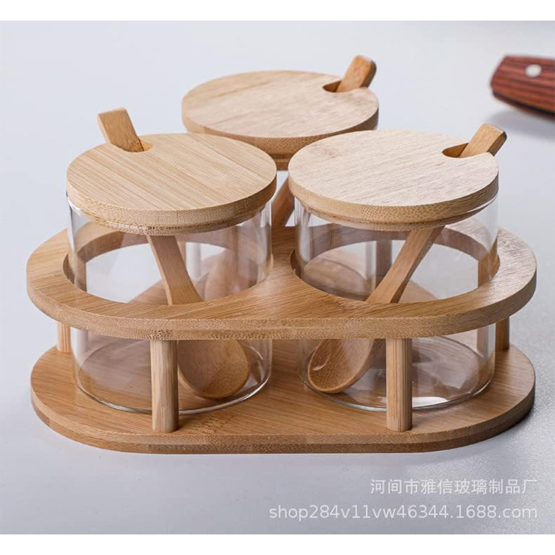 - برطمانات زجاج مع معالق بامبو وأغطية وحامل