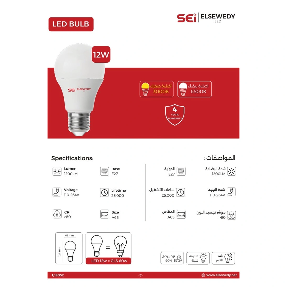 لمبة ليد من السويدي بقدرة 12 وات وقاعدة E27 توفر إضاءة دافئ بسطوع 1200 لومن، ومناسبة للاستخدام اليومي في المنزل أو المكتب.