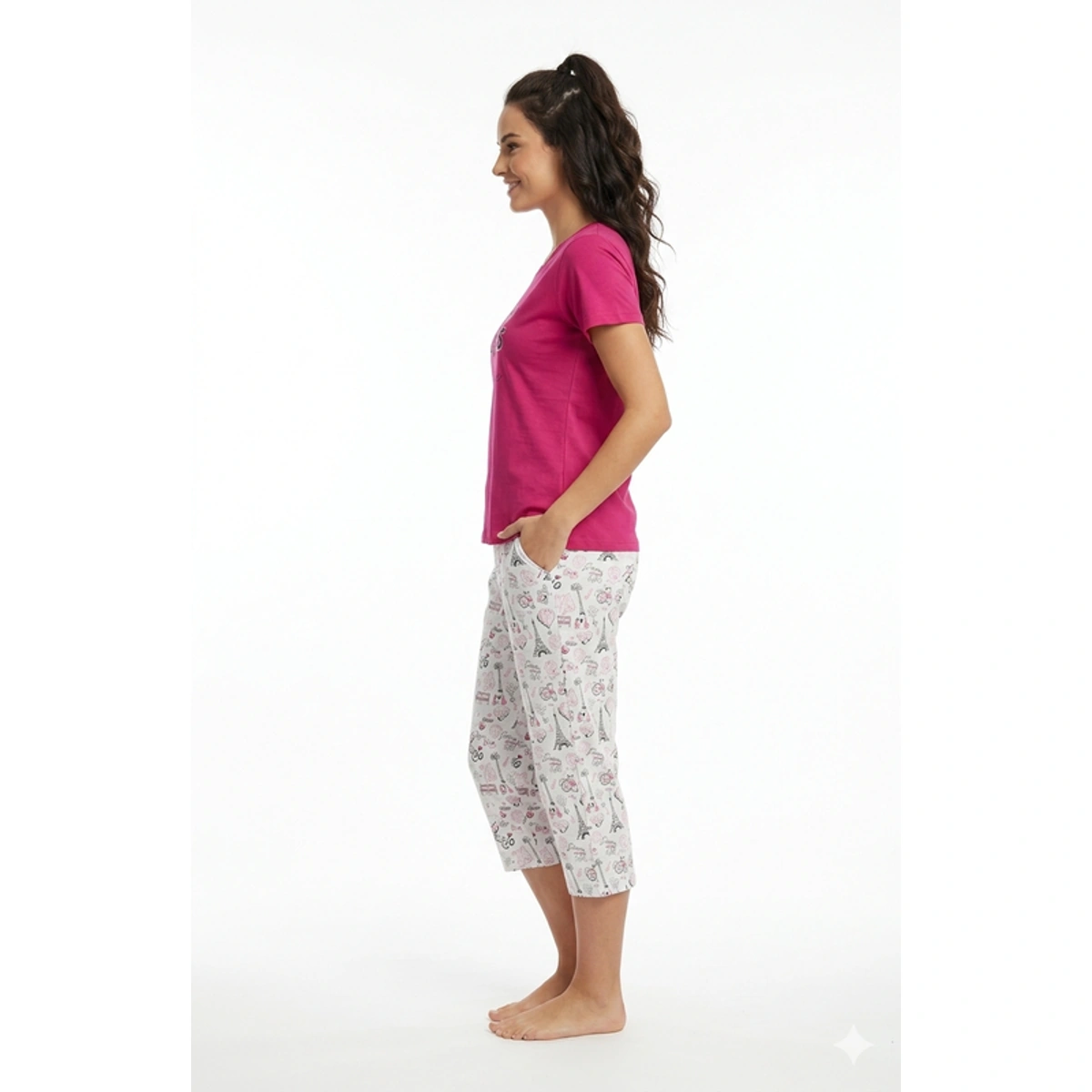 تقدمي بخطوة جريئة نحو الراحة والأناقة مع بيجامة "الحب موجود هنا" من كارينا - 70197-99! التصميم السحري للبيجامة النسائية صُمم خصيصًا ليوفر لكِ إحساسًا مريحًا وأناقة لا مثيل لها، حيث تحتوي على تي شيرت وردي قصير الأكمام يحمل رسمة "Love is Here" الجميلة، مع تفاصيل قلوب لطيفة تضيف لمسة مرحة لكل لحظة ارتداء. الأناقة تكملها ياقة دائرية مريحة تتيح لكِ حرية الحركة بدون قيود، وقصة مريحة مثالية لنوم هادئ أو للاسترخاء بعد يوم طويل. السروال الكابري الأبيض يأتي مزينًا بطباعة رائعة تضيف لمسة من الجمال، مما يوفر توازن مثالي بين التغطية والتهوية، مع خصر مرن يوفر ملاءمة آمنة ولطيفة. هذه البيجامة مناسبة تمامًا للطقس الدافئ وارتداء داخلي على مدار السنة، مما يجعلها إضافة أساسية لخزانة ملابس النوم الخاصة بكِ. سواء كانت لكِ صباحات كسولة، ليالي أفلام مريحة، أو أوقات استرخاء، ستجعلكِ هذه البيجامة تشعرين بالراحة والأناقة في كل لحظة. قماشها الناعم يضمن لكِ الرفاهية ويعزز التصميم الجذاب، لذا لا تفوتي فرصة اقتناء هذه المجموعة المنسقة التي تضمن لكِ مظهر مرتب وجذاب خلال أوقات استرخائك.