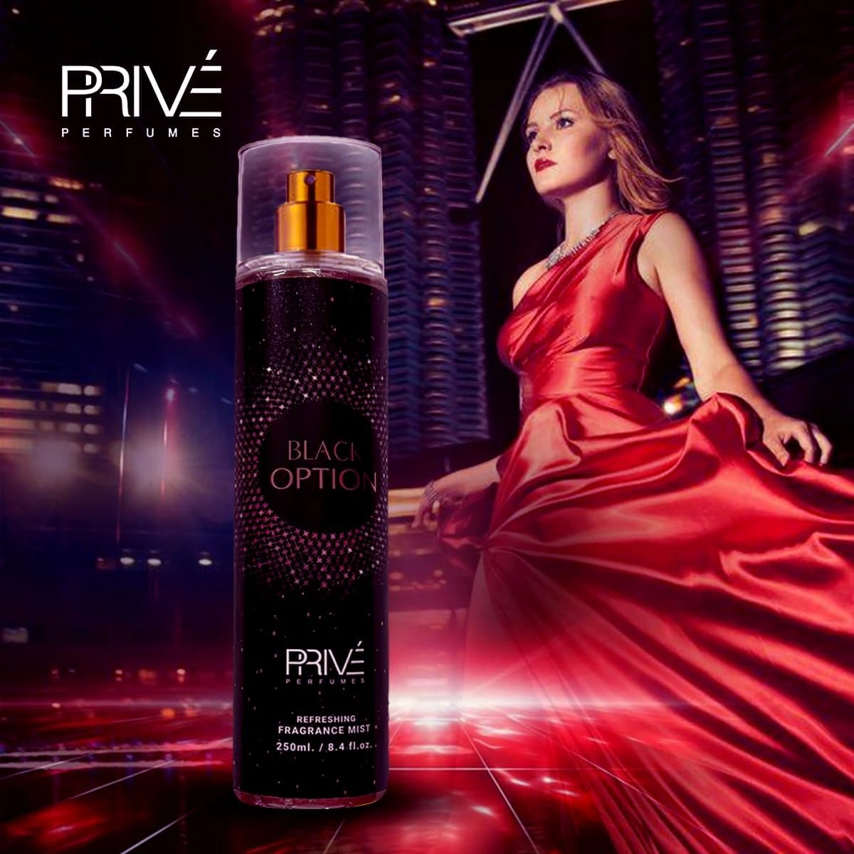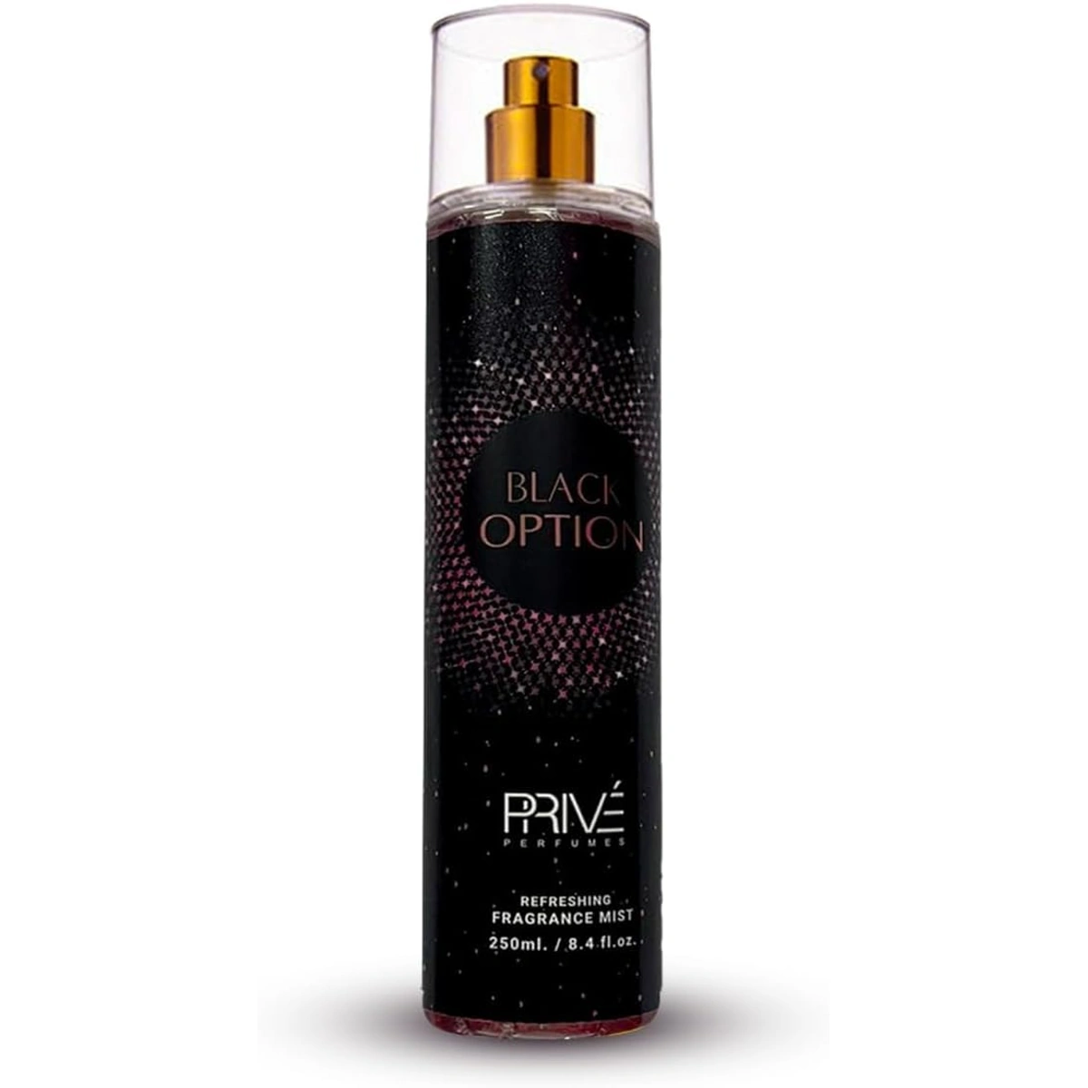 معطر للجسم Prive Black Option للنساء يمنحكِ رائحة جريئة وحسية تدوم طويلاً. مزيج فريد من النفحات العطرية ليضيف لحضورك لمسة من الأناقة والجاذبية في كل مناسبة.