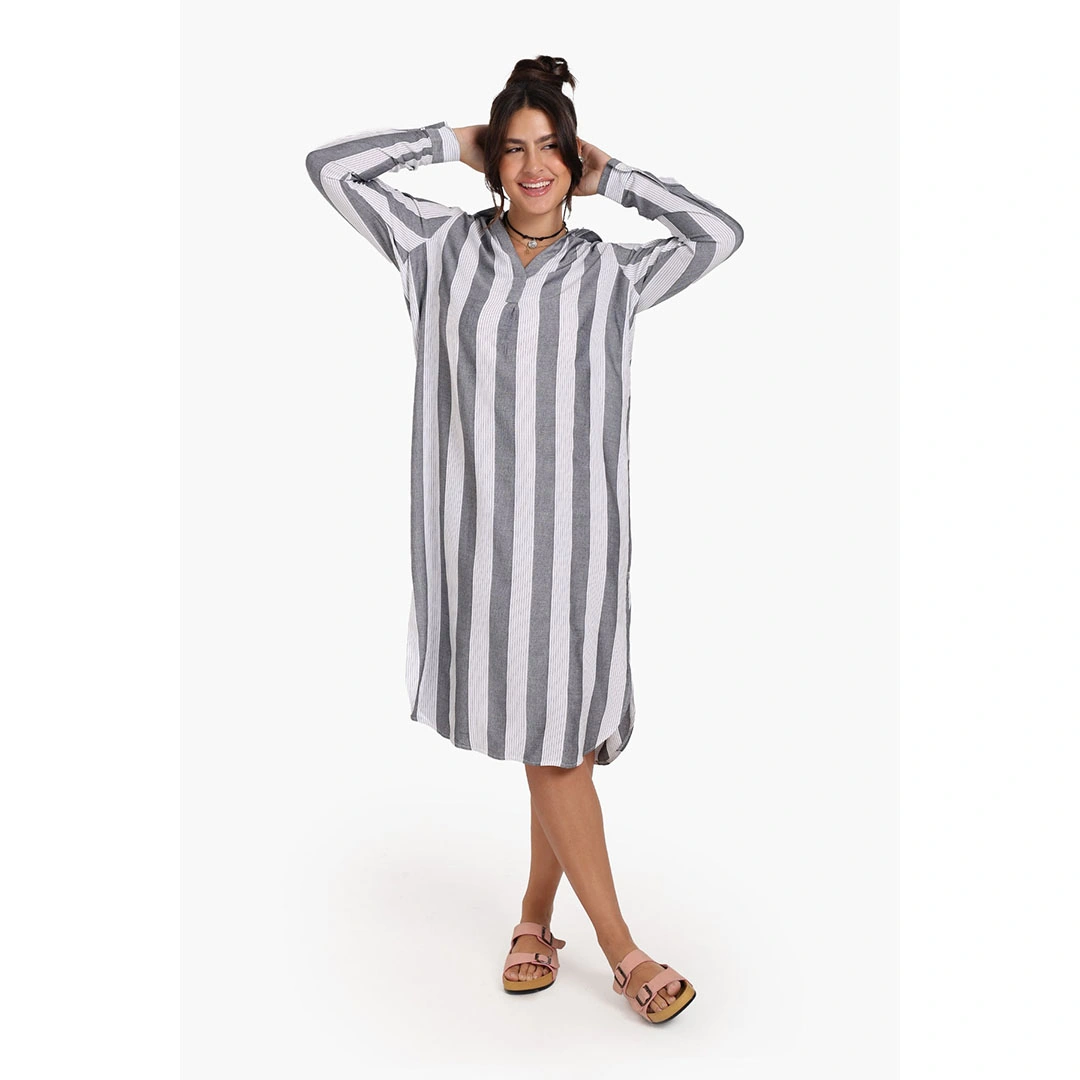 تجمع فستان الميدي المخطط المصنوع من قطن تنسيل بين الراحة القابلة للتنفس والبنية البسيطة الأنيقة. تم تصميمه بقصة فضفاضة، ويتميز بياقة مرتفعة وأكمام طويلة مع أساور مزررة، وطول ميدي متدفق مع فتحات جانبية خفية لإضافة سهولة في الحركة. خفيف الوزن وسهل الارتداء، يضفي النمط المخطط لمسة كلاسيكية، مما يجعله مثاليًا للإطلالات اليومية، أو لمظهر المكتب، أو لأسلوب عطلة نهاية الأسبوع. يمكنك تنسيقه بطرق متعددة، مثل تحديد الخصر بحزام وارتداءه مع حذاء كاحل لإطلالة راقية، أو ارتدائه بشكل فضفاض مع حذاء رياضي أبيض وحقيبة كبيرة لمظهر عصري غير رسمي، كما يمكنك إضافة طبقة من سترة بلا أكمام لمسة عصرية، أو لف الأكمام وارتداءه مع صنادل لمظهر مريح خلال اليوم، أو إضافة سترة مصممة وكعب عالي للحصول على إطلالة جاهزة للعمل.
