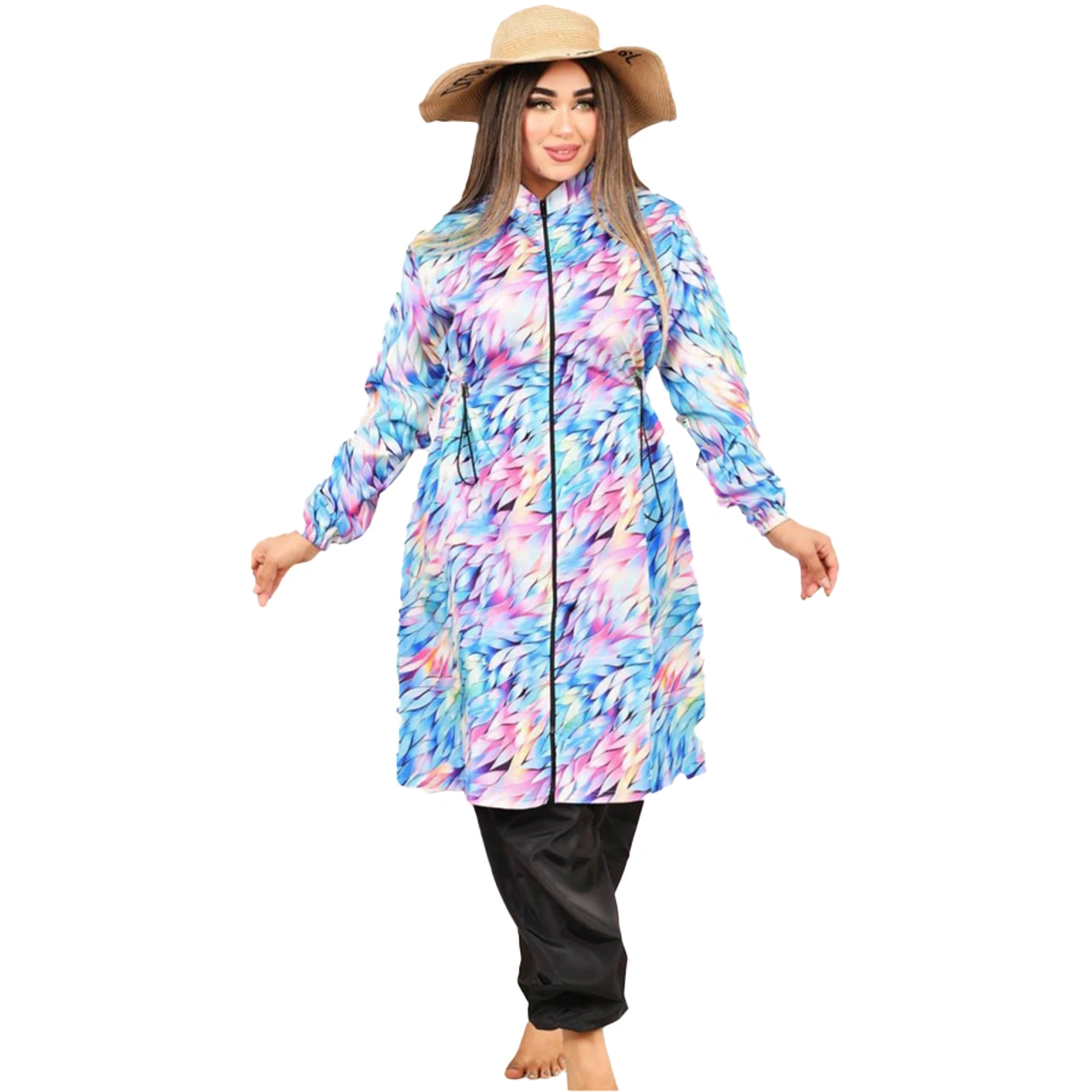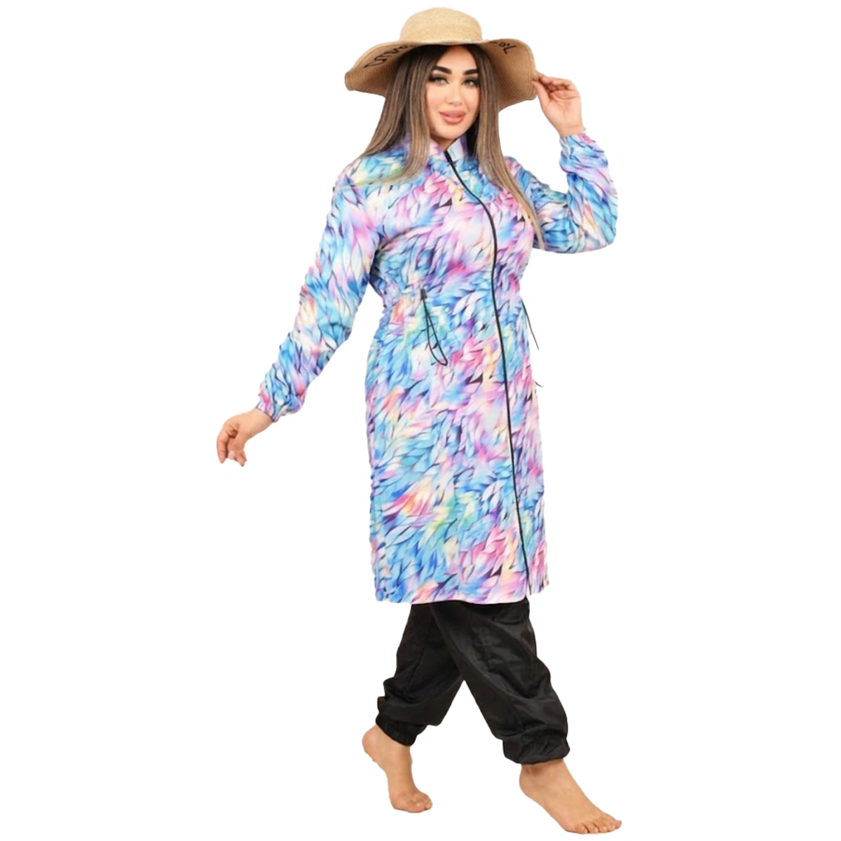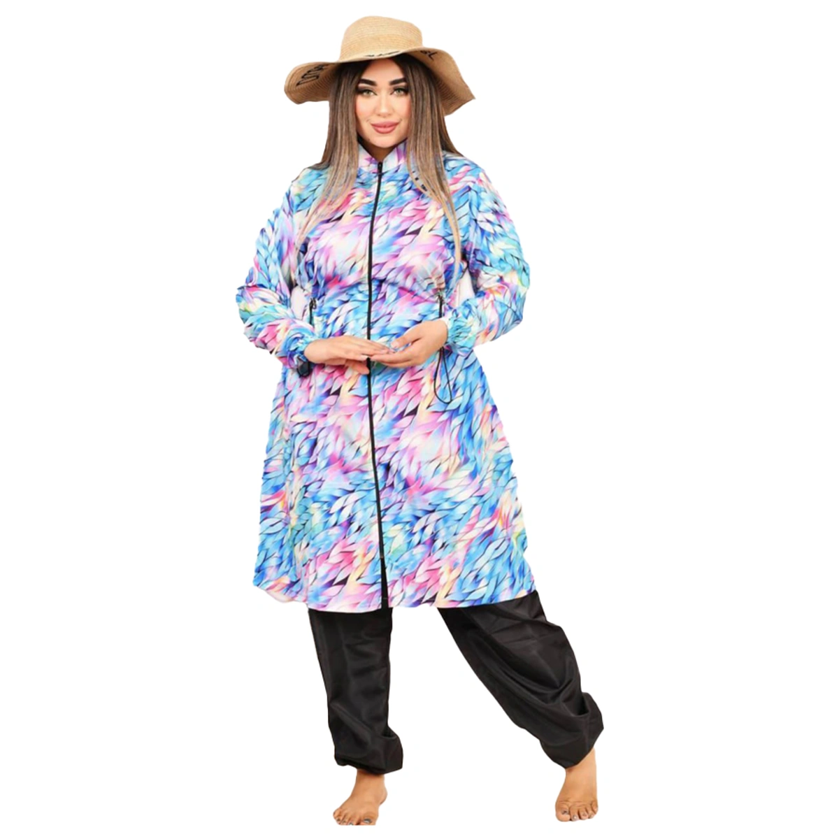 - نوع المنتج: بوركيني متكامل (تونيك بأستيك وسط، بنطلون، بونيه)
