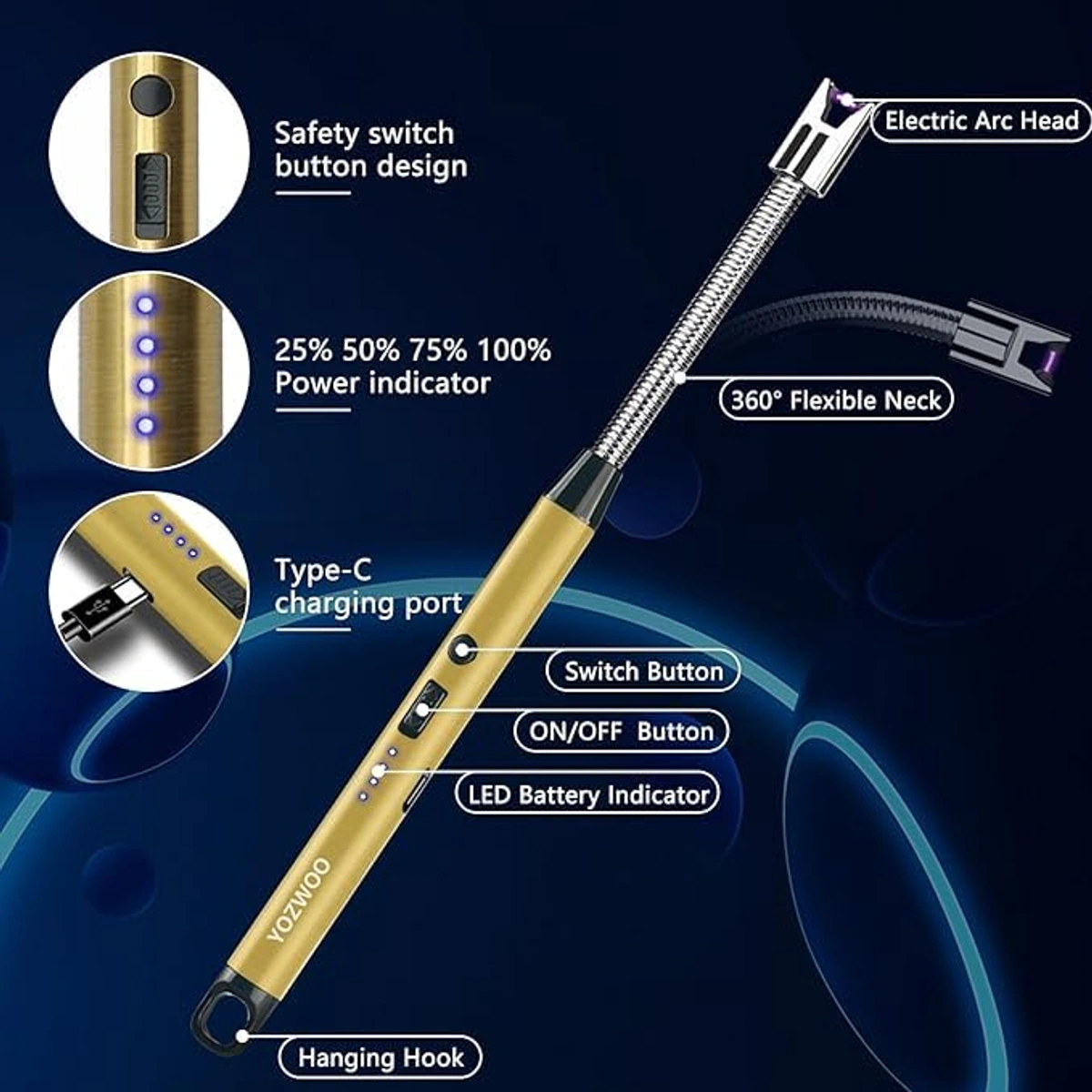 • رقبة طويلة من أجل تعزيز السلامة: تتميز الرقبة المرنة الممتدة بأنّها توفر إمكانية إشعال الفتائل التي يصعب الوصول إليها أو منافذ الغاز مع إبقاء اليدين بأمان وبعيدًا عن منطقة اللهب، لذلك فإنّها مثالية للتعامل مع الشموع الطويلة.