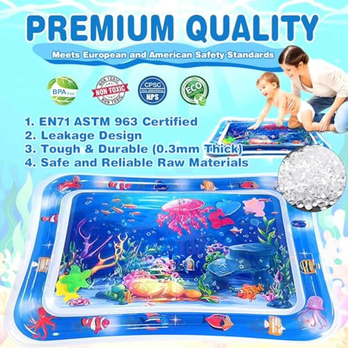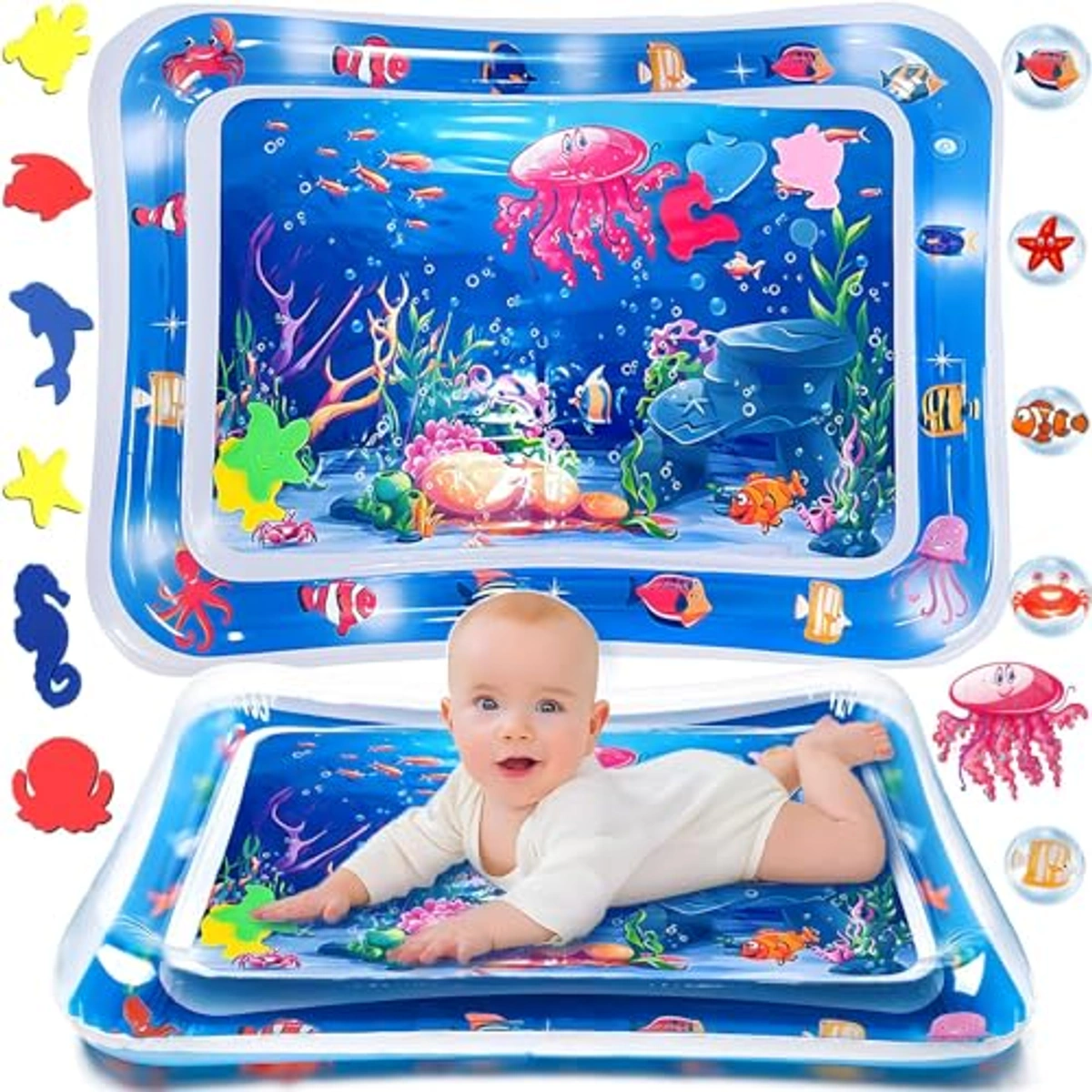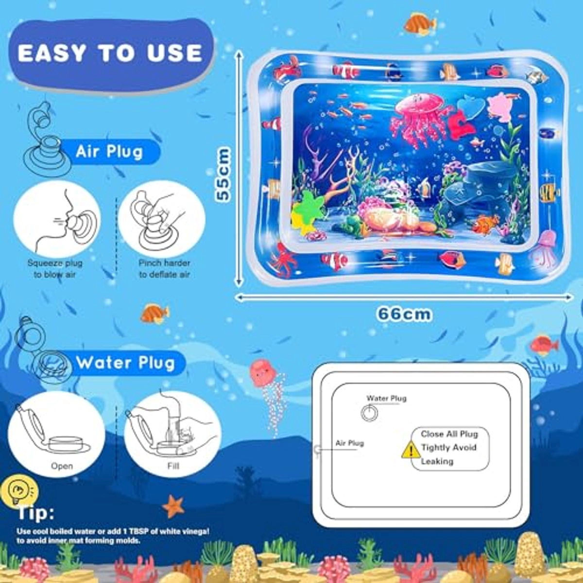 استمتع بوقت ممتع ومليء بالتعلم مع بساط اللعب المائي المذهل، الذي يأتي بأبعاد 66*50 سم، ويقدم تجربة لعب فريدة من نوعها للأطفال من سن 0 إلى 3 سنوات. مصنوع من بلاستيك بي في سي عالي الجودة، معتمد من سي بي سي وسي اي، مما يضمن أنه خالي من البيسفينول أ، عديم الرائحة وصحي تمامًا لجلد طفلك. تم تصميم هذا البساط ليكون متينًا ومقاومًا للماء، ليبقى جافًا أثناء اللعب، مما يضمن راحة طفلك. بالإضافة إلى ذلك، يعزز بساط الأنشطة المائية نمو الطفل من خلال تقوية عضلات الرقبة والساق والذراع، مما يساعد على تطوير المهارات الحركية الكبرى. بفضل عالمه البحري النابض بالحياة وألعاب الحيوانات البحرية العائمة، سيساعد بساط اللعب المائي في تعزيز التنسيق بين اليد والعين لدى طفلك. كما أنه سهل الاستخدام والتعبئة، حيث يمكن ملؤه بالهواء والماء بسهولة وتصريفهما عند الانتهاء من اللعب، مما يسهل عملية التخزين. سيكون هذا البساط الحسي المثالي هدية مميزة تجمع بين التعليم والمتعة، ويعد خيارًا رائعًا للأنشطة الخارجية مثل النزهات ورحلات الشاطئ. مع تعليمات بسيطة لتنظيفه وتجهيزه للاستخدام مرة أخرى، ستضمن تجربة لعب مريحة وشيقة لطفلك.