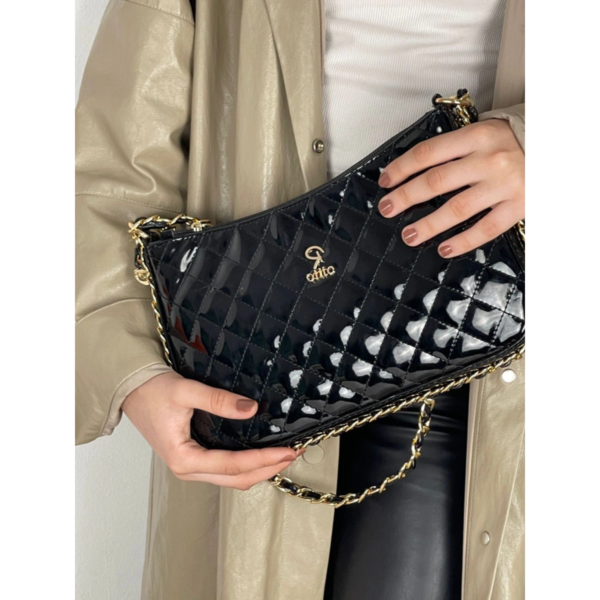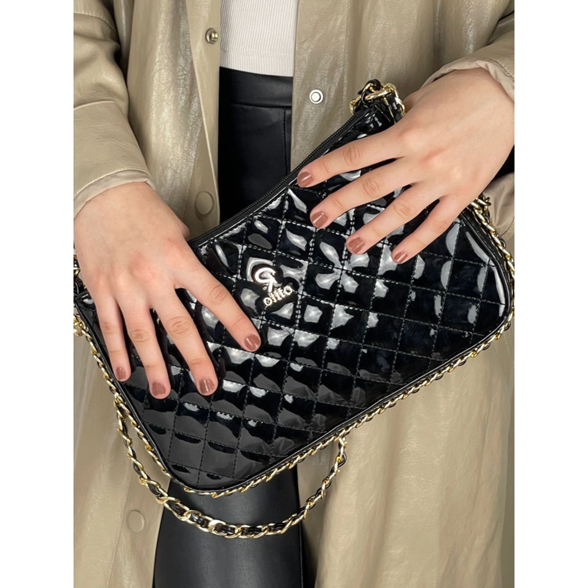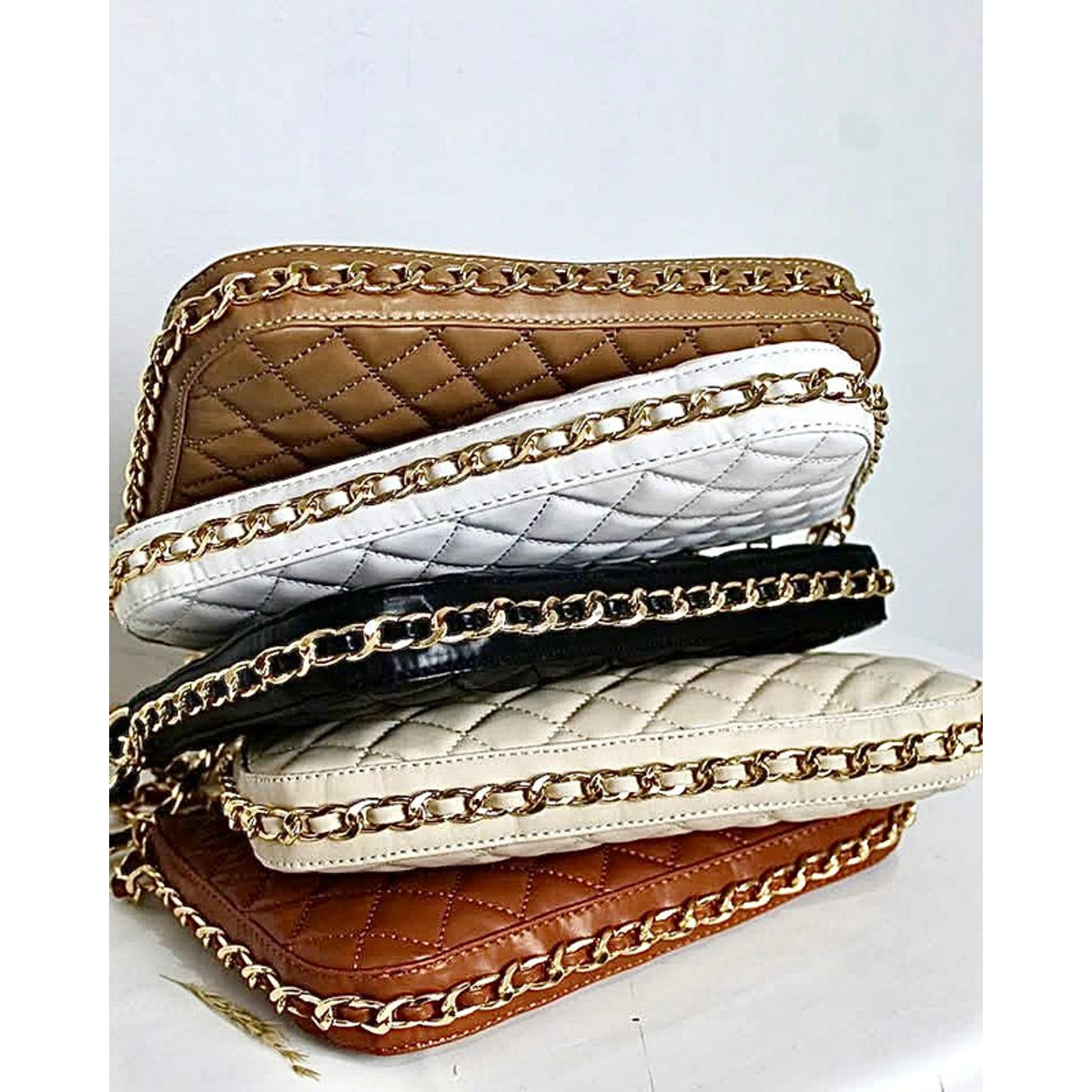 شنطة كلاتش بتصميم مبطن مع يد سلسلة وحزام كروس من روتيتو بتصميم مبطن أنيق وخامة جلد PU، ويمكن حملها ككلاتش أو باستخدام حزام الكروس، مما يجعلها مناسبة للمشاوير والسهرات بإطلالة مميزة.
