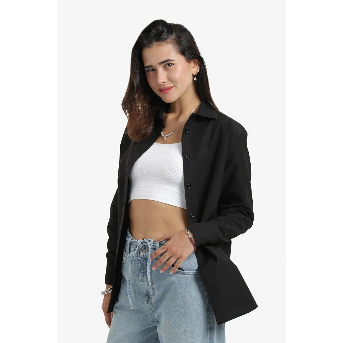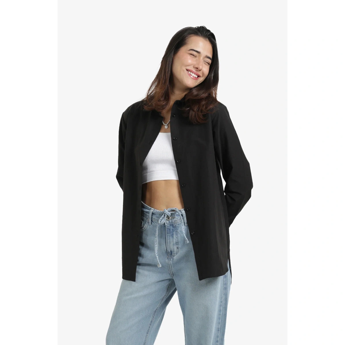 قميص خليط قطن بقصة مريحة، بياقة كلاسيك وقفل بأزرار بطول القطعة بالكامل وأكمام طويلة. تصميم هاي لو مع ذيل دائري وفتحات جانبية يدي حركة ومرونة، مناسب للوك كاجوال أو شيك.