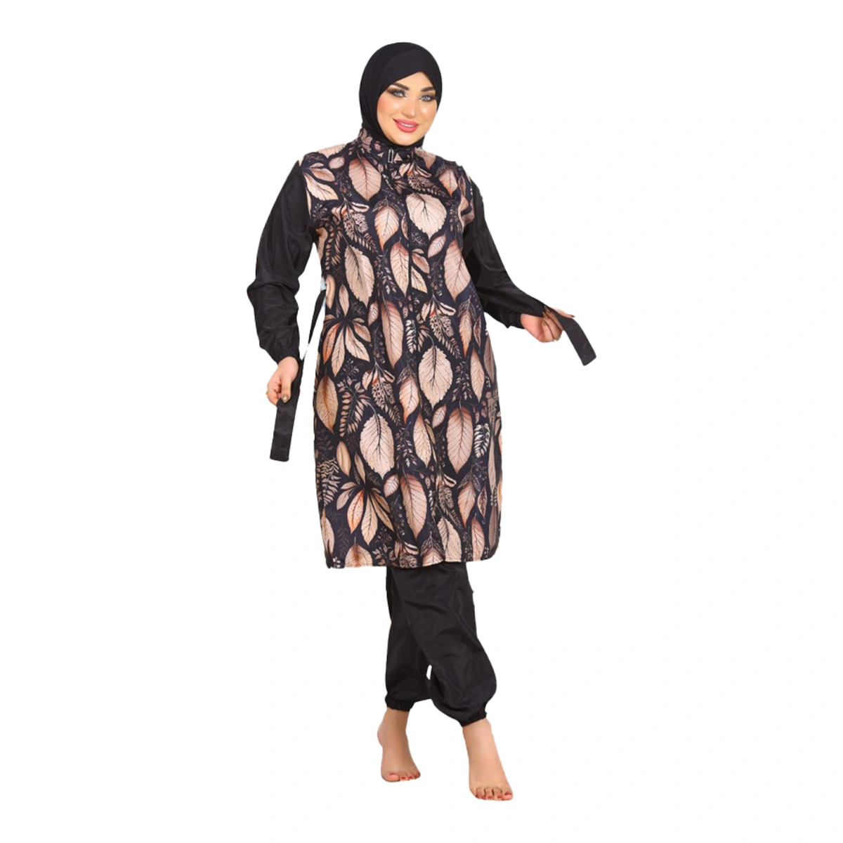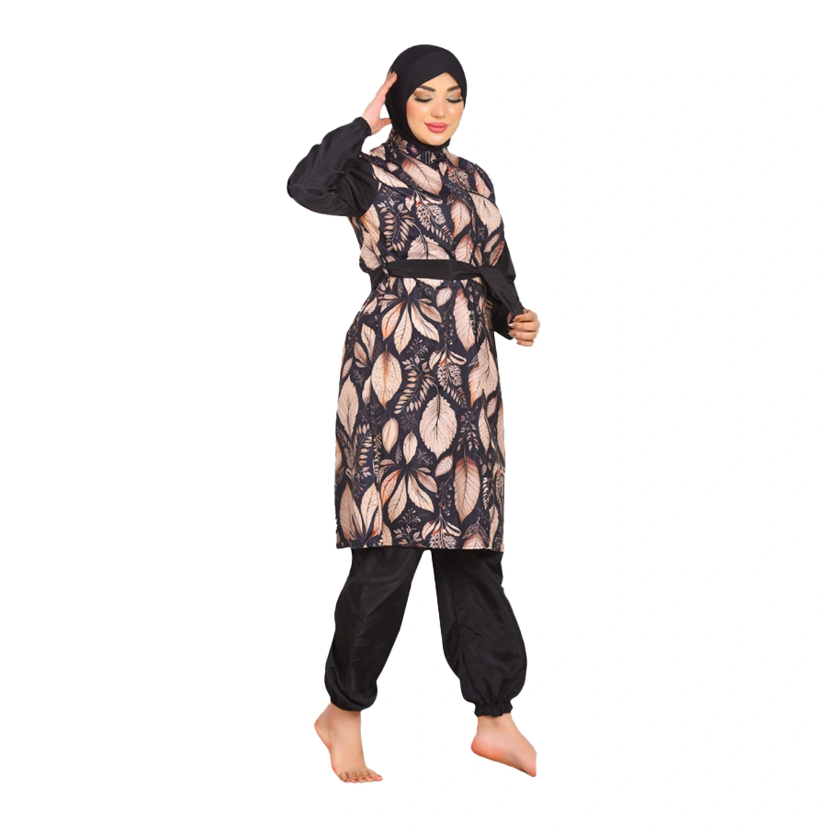 استمتعي بالسباحة بأناقة واحتشام مع بوركيني Gamal sons المكون من 4 قطع. خامة وتر بروف معالجة بلون أسود وكافيه، مثالي للراحة والثقة في كل مرة.