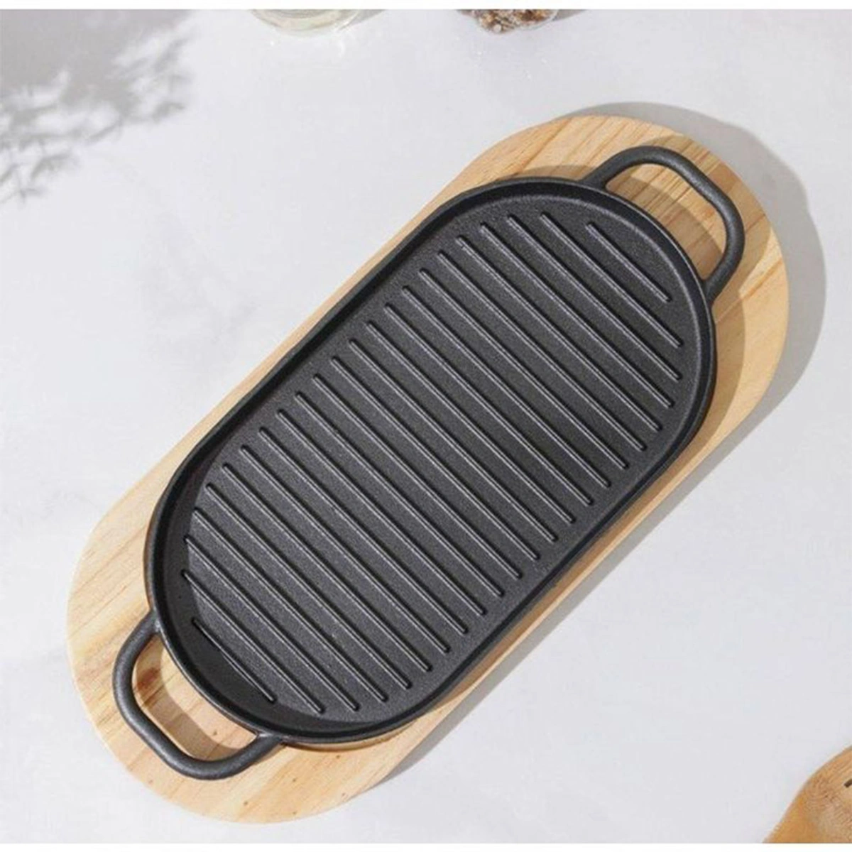 الشواية اللي بقاعدة خشبية دي عملية جدًا سواء للتقديم أو للطهي الخفيف. الطبق الحديدي يتحمل النار والحرارة كويس، والقاعدة الخشب تسهّل حملها ونقلها من المطبخ للترابيزة. شكلها شيك وبتدي إحساس شهي عند التقديم خصوصًا في العزومات أو الأكلات اللي عايزة تبقى سخنة على الترابيزة. سهلة التنضيف ومناسبة للاستخدام المتكرر.