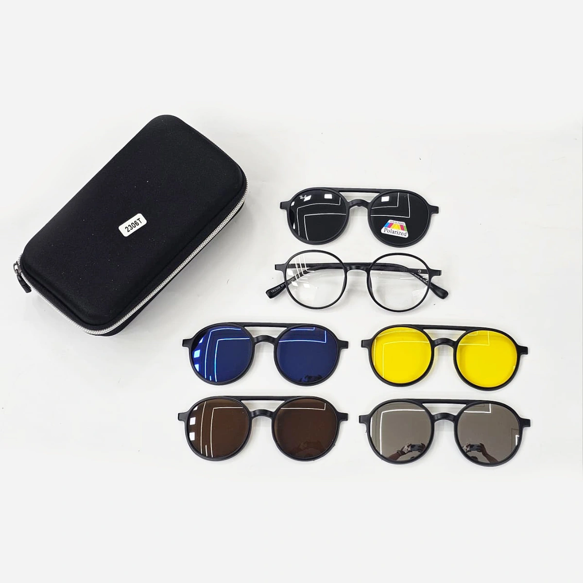 خامة TR خفيفة ومرنة,تقنية Clip On لتغيير العدسات بسهولة,طقم عدسات مكوّن من 5 غيارات,عدسات تناسب الشمس، القيادة، والرؤية الليلية,تصميم عام يناسب جميع الموديلات,تأتي مع الجراب الأصلي للحماية الكاملة,مكونات البوكس(نظارة بإطار TR90,5 عدسات Clip-On متنوعة,جراب أصلي مبطن لحفظ النظارة والعدسات)