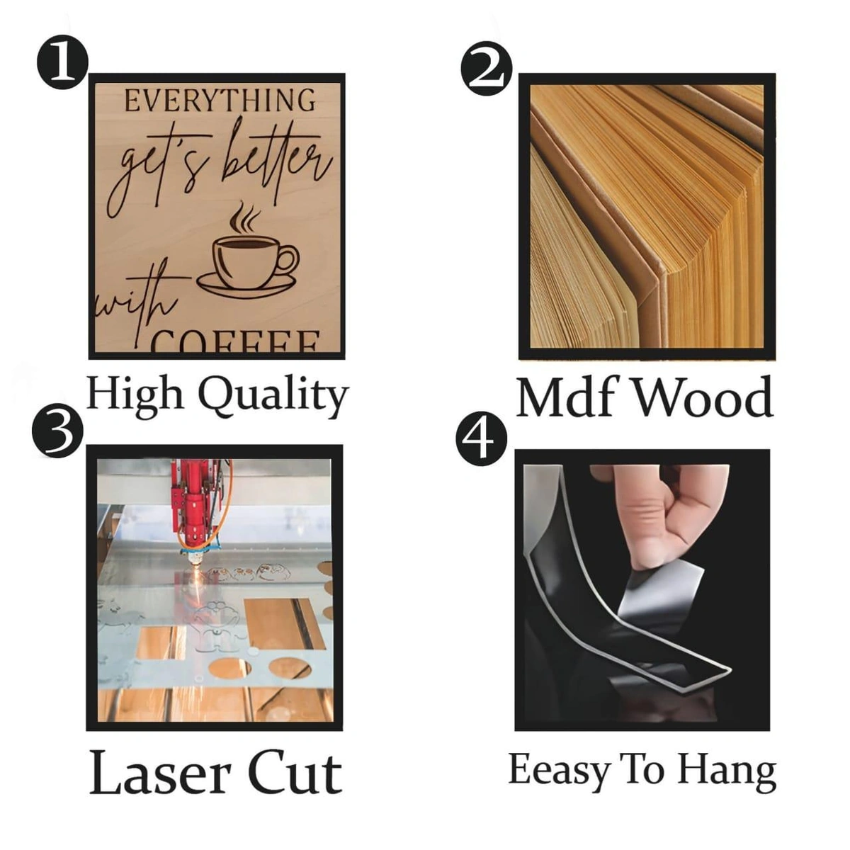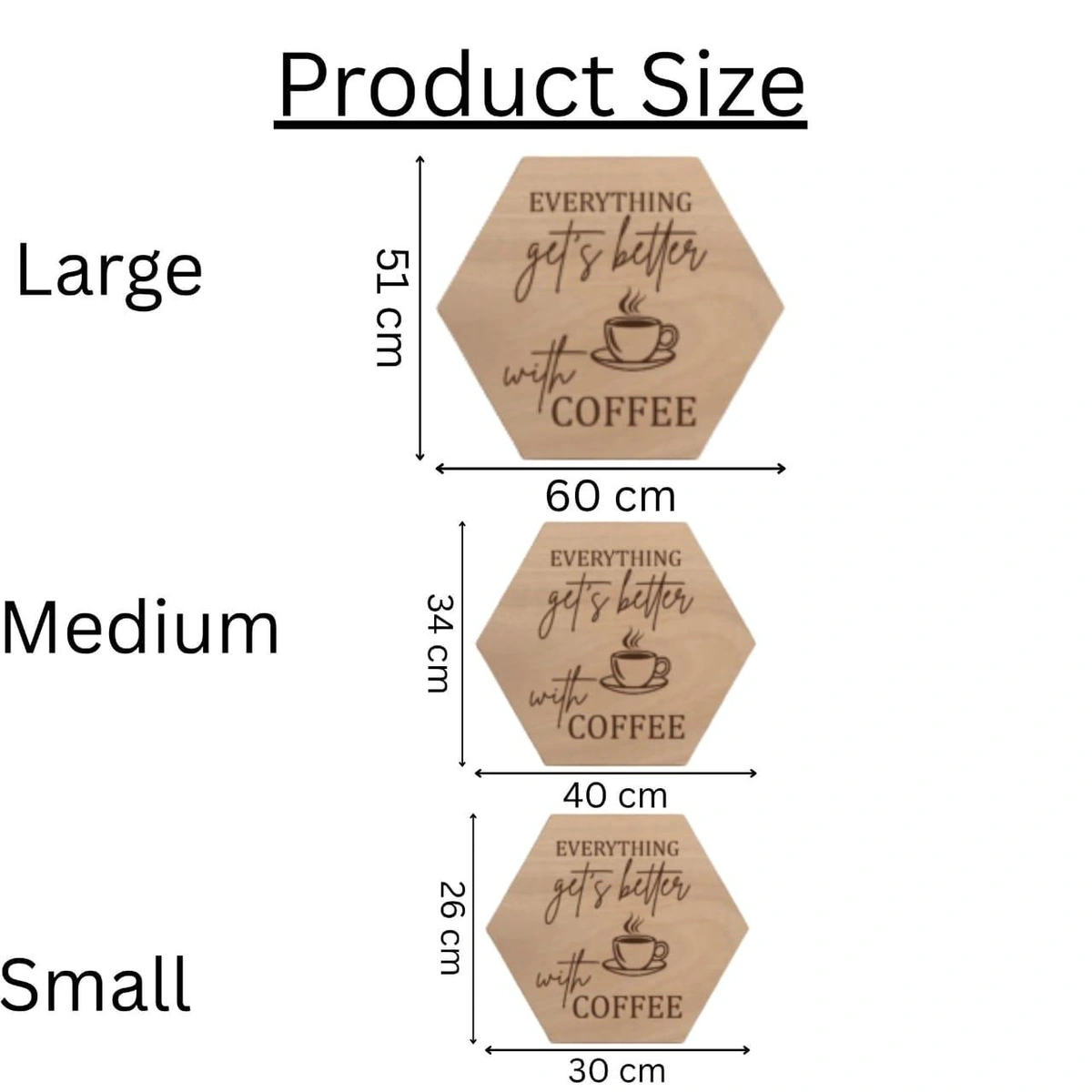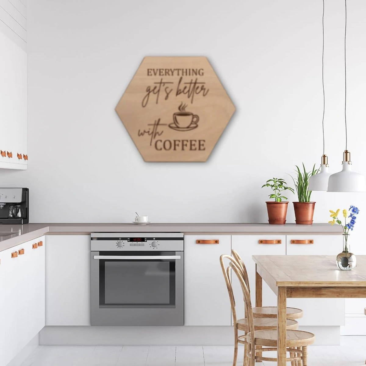 أضف لمسة عصرية وأنيقة لمطبخك أو ركن القهوة بديكور حائط ATM الخشبي السداسي. تصميم مميز بعبارة "كل شيء يصبح أفضل مع القهوة" وخامة MDF عالية الجودة باللون الأسود. مثالي لعشاق القهوة لإضفاء جو من الدفء والأناقة.