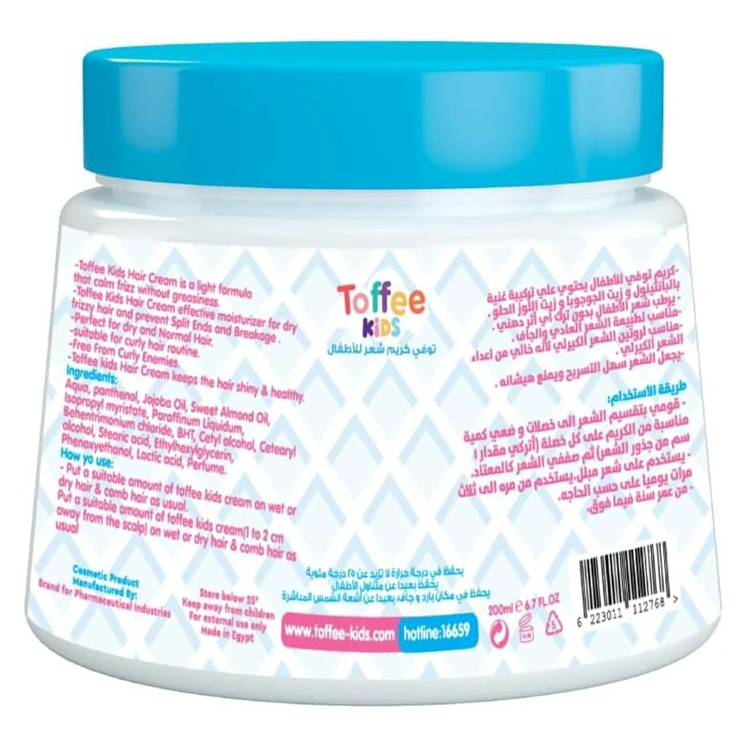 دللي شعر طفلك مع كريم شعر للأطفال من توفي بحجم 200 مل! تركيبتنا اللطيفة والمغذية مصممة خصيصًا لترطيب وتنعيم شعر الأطفال، مما يجعله سهل التسريح وأكثر صحة ولمعانًا. كريم توفي مثالي للاستخدام اليومي، فهو يحمي الشعر من الجفاف ويمنحه مظهرًا جذابًا دون ترك أي بقايا دهنية. احصلي على شعر ناعم ولامع لطفلك مع كريم توفي، الخيار الأمثل للعناية بشعر الأطفال.