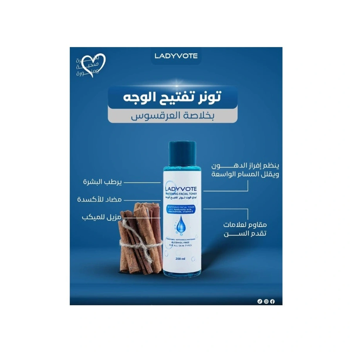 - يعزز التفتيح عند استخدامه مع منظف Ladyvote Skin Brightening Cleanser