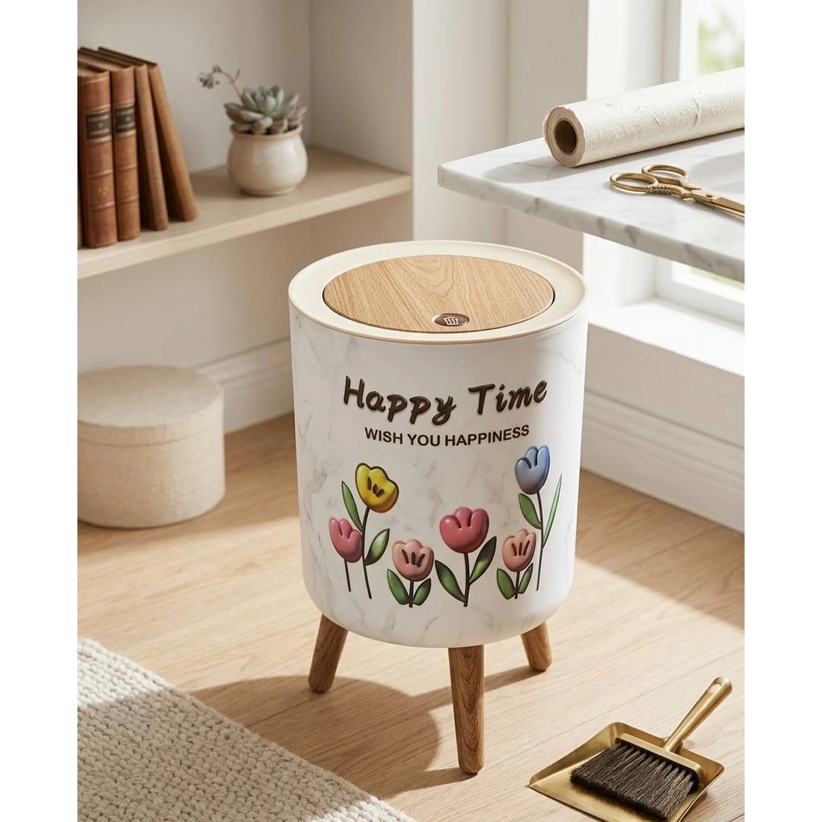عايز سلة مهملات شيك وعملية لمكتبك أو بيتك؟ سلة المهملات الصغيرة دي بشكل وردة وغطاء وقاعدة خشب هتبقى لمسة جمالية ووظيفية في أي مكان!