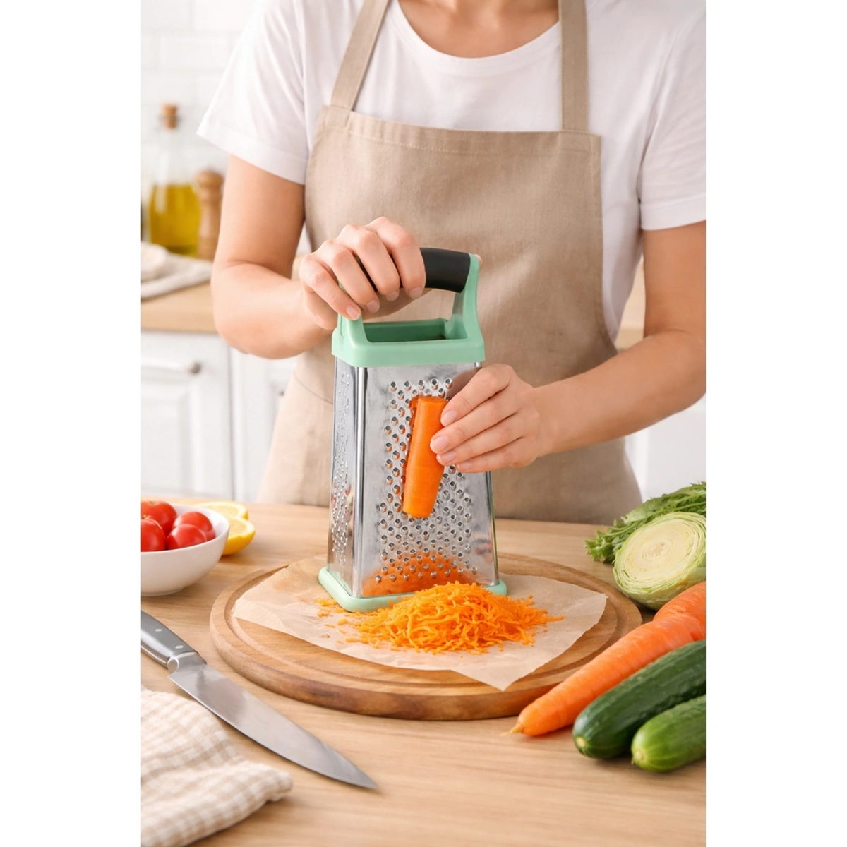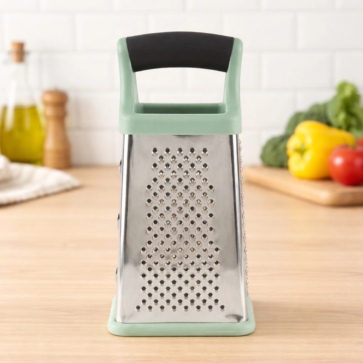 مبشرة Group Tiger المربعة الستانلس بمقبض سيليكون مقاس 8 بوصة، تصميم متين وعملي لجميع احتياجاتك في المطبخ. ابشر الخضروات والجبن بسهولة وأمان مع هذه الأداة الأساسية.