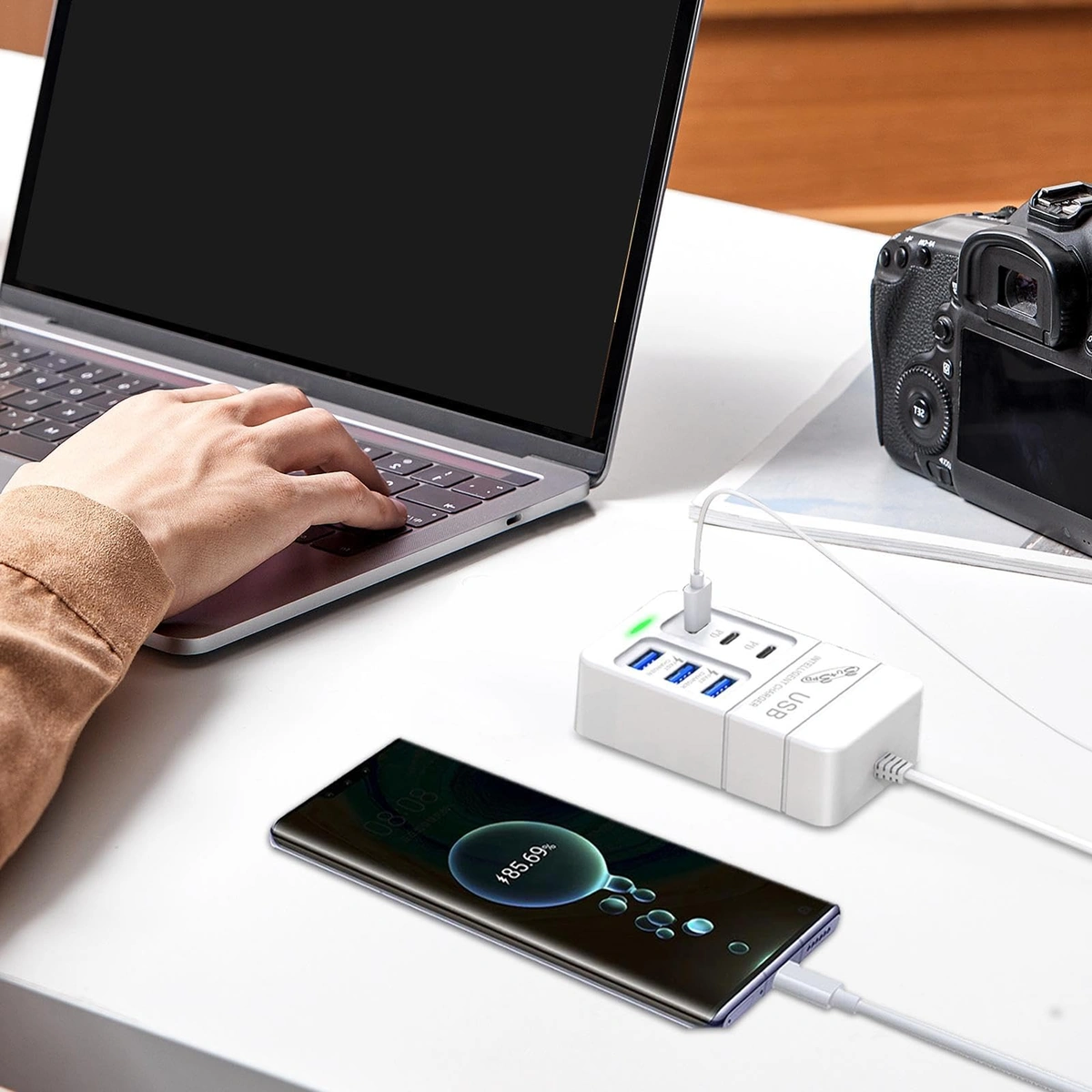 اكتشف موزع شحن USB سريع 65 واط صغير للسفر، الحل المثالي لمن يحتاجون إلى شحن عدة أجهزة في وقت واحد بكفاءة عالية. يتميز هذا الموزع بتصميمه المدمج والعملي، مما يجعله رفيقاً ممتازاً في رحلاتك. بفضل تقنية الشحن السريع، يمكنك شحن الهواتف الذكية، والأجهزة اللوحية، واللابتوبات بسرعة فائقة، مما يوفر لك الوقت ويضمن لك تجربة سفر مريحة. احصل الآن على موزع شحن USB سريع 65 واط صغير للسفر وودع عناء الشحن البطيء!