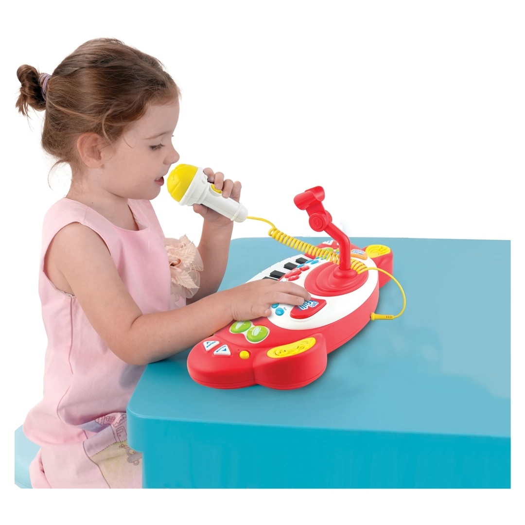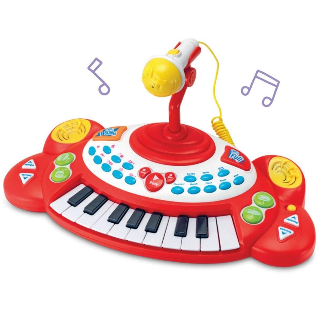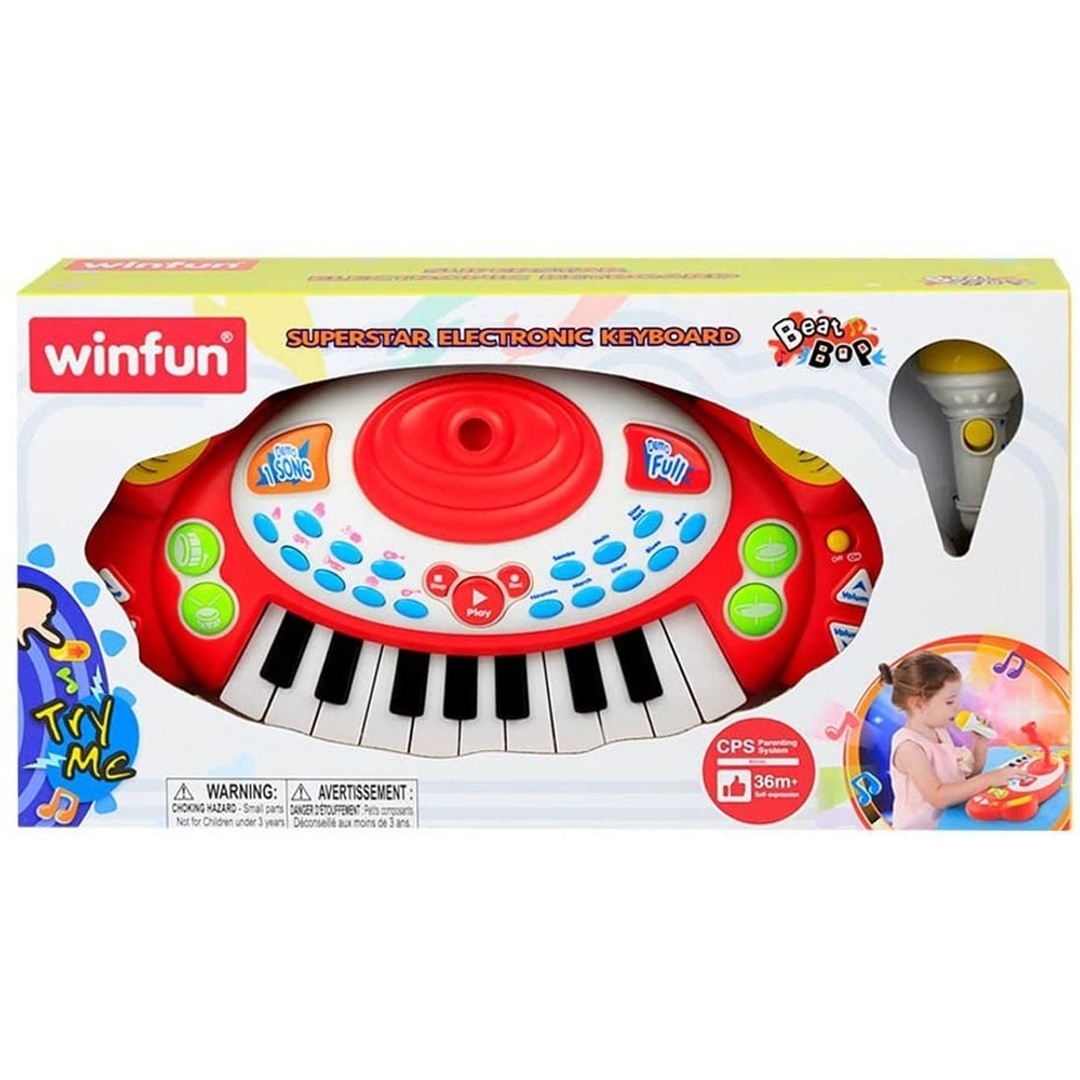 لوحة مفاتيح إلكترونية سوبر ستار مع ميكروفون تهز المسرح! أطلق العنان للنجم الذي بداخلك مع لوحة مفاتيح سوبر ستار الإلكترونية! صُممت لوحة المفاتيح التفاعلية هذه لعشاق الموسيقى الصغار، وهي مزودة ب 11 مفتاحًا وميكروفونًا حقيقيًا يعمل والكثير من الميزات الممتعة لابتكار روائعك الموسيقية الخاصة بك. مع الإيقاعات المدمجة والأغاني التجريبية وأصوات الآلات الموسيقية وحتى وظيفة التسجيل والتشغيل، يمكن للأطفال العزف والغناء والأداء تمامًا مثل نجوم البوب المفضلين لديهم. يسمح لهم الميكروفون القابل للتعديل بالغناء أثناء العزف، مما يحول أي غرفة إلى مسرح للحفلات الموسيقية! إن لوحة المفاتيح هذه مثالية للموسيقيين الناشئين واللعب الإبداعي، فهي توفر صوتًا كبيرًا ومتعة كبيرة في مجموعة واحدة رائعة.