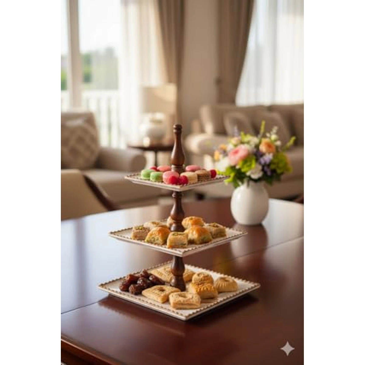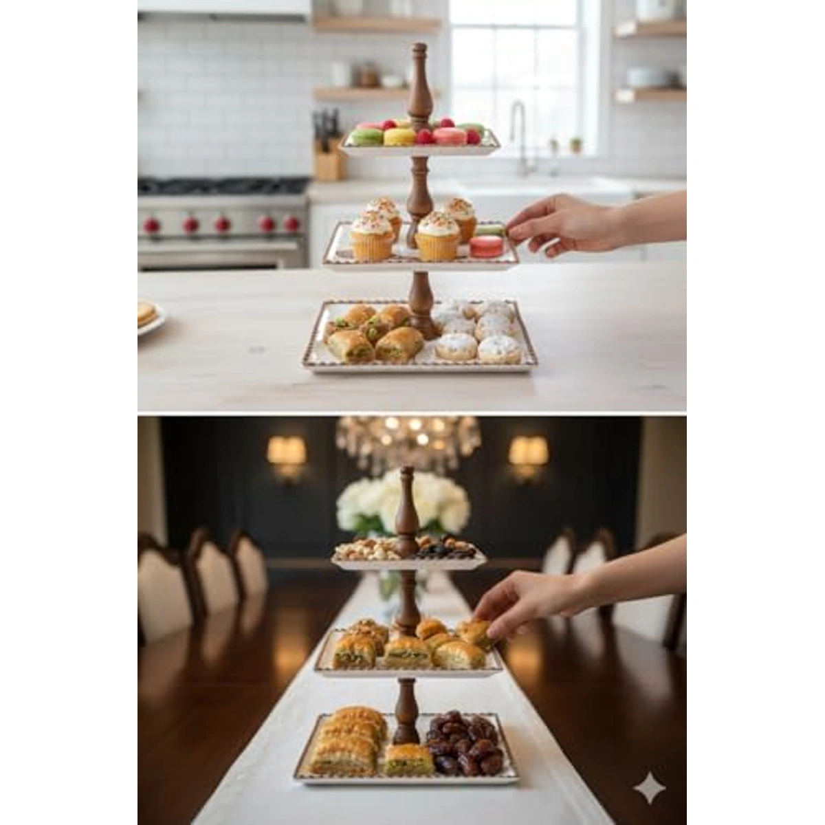 اكتشف حامل التقديم المثالي لتجربة تقديم لا تُنسى مع تصميمه المتميز وأناقته الفريدة. يأتي هذا الحامل المصنوع من البورسلين والخشب بلونين جذابين، الأبيض والبني، مما يتيح لك تنسيقه بسهولة مع أي ديكور. يتكون من 3 طبقات توفر مساحة كافية لتقديم الأطعمة والمشروبات بشكل مرتب وأنيق. بفضل التشطيب النهائي غير اللاصق، يمكنك الاستمتاع بتقديم الطعام دون القلق من التصاقه بالسطح. الشكل المربع للحامل يضيف لمسة من الأناقة والرسمية، بينما يعمل سطح البورسلين على تعزيز جاذبية المنتج ويضمن لك الحفاظ على جودة الطعام. اختر حامل التقديم هذا لإضفاء لمسة من الفخامة على حفلاتك ومناسباتك الخاصة.