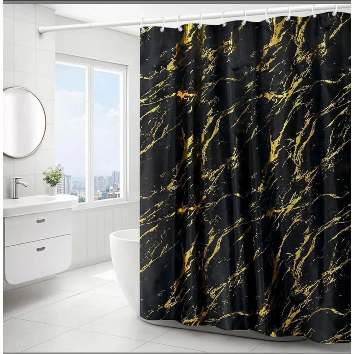 استمتع بأناقة لا مثيل لها مع ستارة الحمام بتصميم رخامي فخم تجمع بين اللونين الأسود والذهبي، مما يضفي لمسة عصرية ومميزة على أي حمام. مصنوعة من قماش عالي الجودة يمتاز بخاصية طرد الماء، هذه الستارة توفر حماية فعالة لأرضية الحمام من البلل، بينما تأتي بأبعاد مثالية 180×180 سم تناسب معظم أحواض الاستحمام والدشات القياسية. تركيبها سهل ومريح بفضل 12 حلقة تعليق شفافة، مما يجعلها مناسبة للاستخدام في الحمامات المنزلية والفنادق على حد سواء، وتضيف لمسة من الرقي لأي ديكور داخلي.