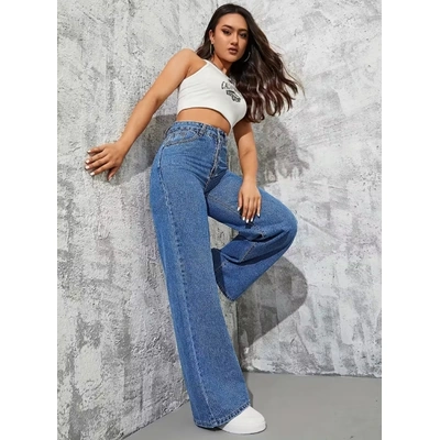 بنطلون حريمي جينز واسع الساق - أزرق