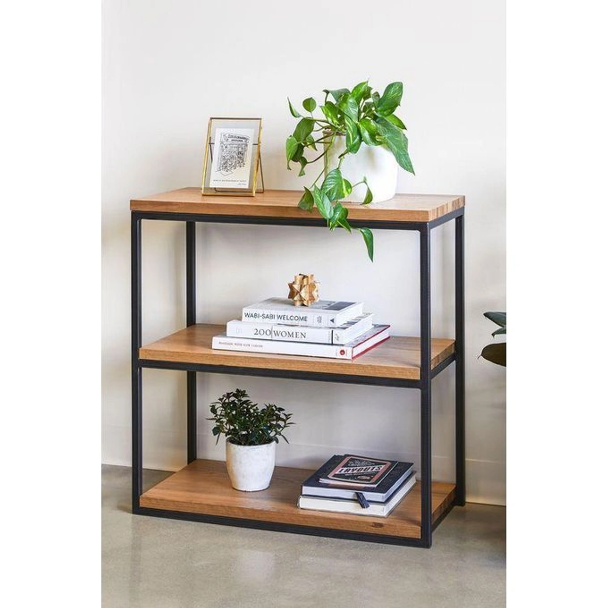 تصميم عصري: كونسول بتصميم هندسي مميز مع هيكل من الستيل الأسود وأسطح خشبية متعددة المستويات,هيكل معدني متين من الستيل مع أسطح MDF عالية التحمل بلون خشبي حمري جذاب,سهولة التنظيف: تصميم مفتوح يسهل الوصول لجميع الأسطح للتنظيف والعناية اليومية
