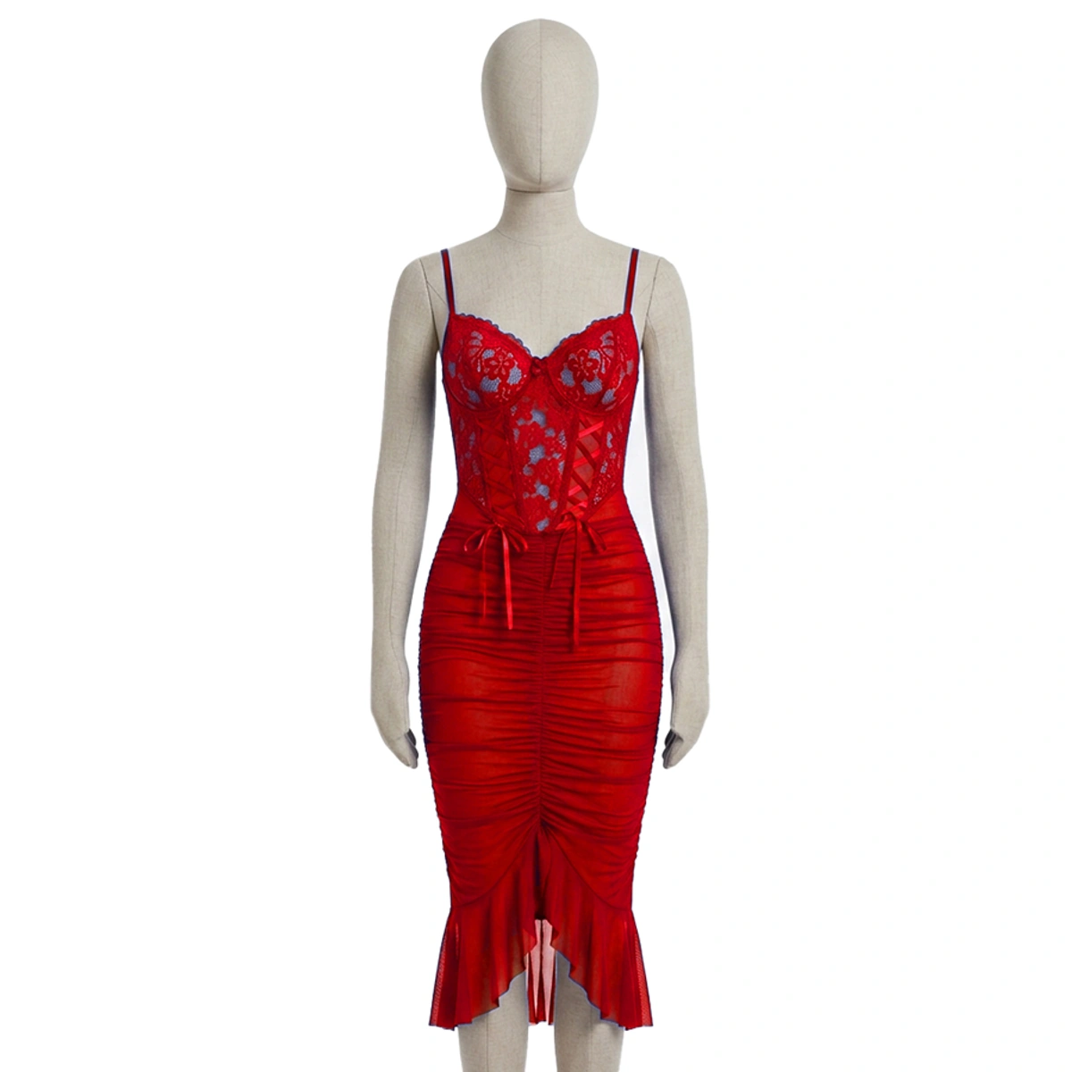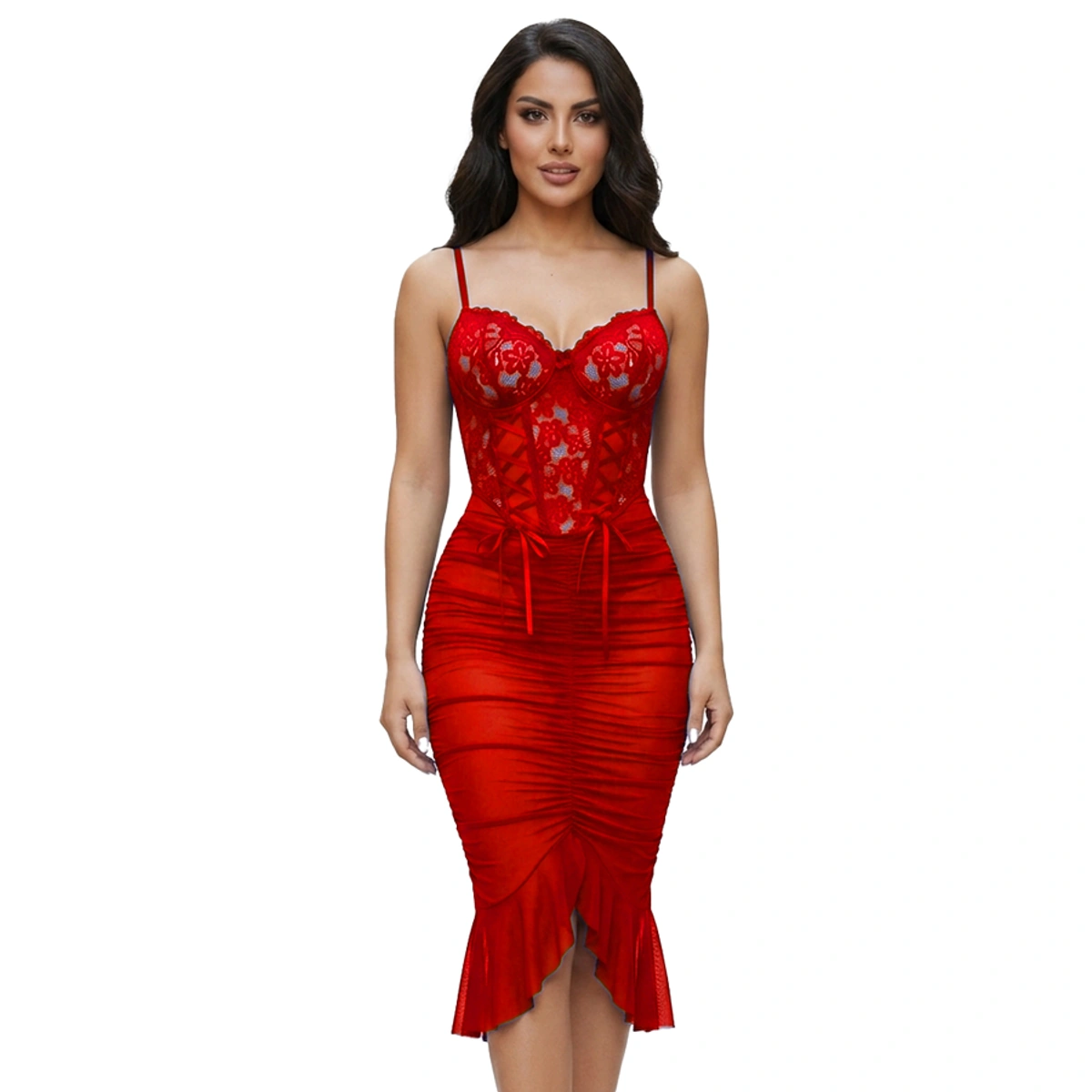 أضيفي لمسة من الأناقة والجاذبية لإطلالتك مع قميص Gamal sons الطويل المصنوع من الدانتيل الأحمر، يتميز بتصميم فريد بكرنيشة سفلية ومكون من قطعتين ليمنحك مظهراً متكاملاً وعصرياً.