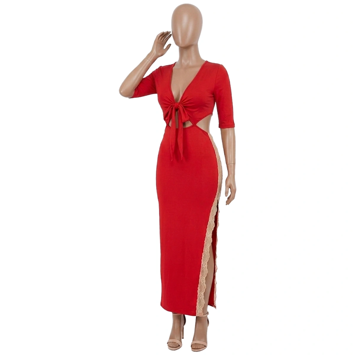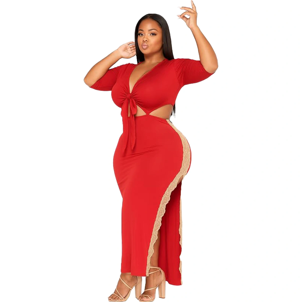 تألقي بفستان سهرة طويل أحمر من Gamal sons بتصميم دانتيل أنيق وفتحة جانبية وعقدة أمامية مميزة. مثالي لمناسباتك الخاصة بلمسة من الأناقة والجاذبية.